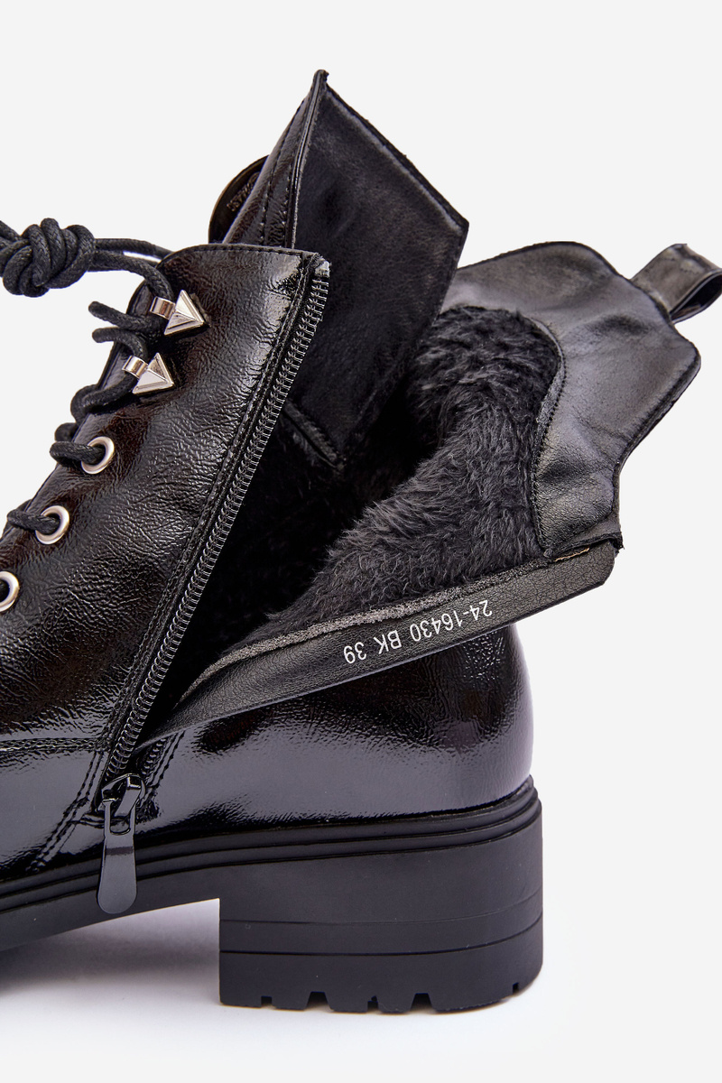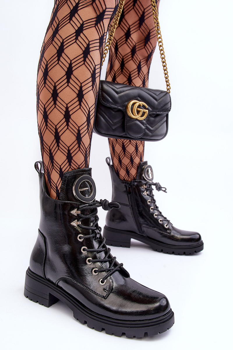 Women's boots set on a flat, stable heel. Made of eco leather. Inside insulated with shoemaker's wadding. On the tongue an ornament made of plastic. Fastened with a zipper and additionally laced. The toe is stiffened. Round noses. Perfect for the autumn-winter season for many styling! When choosing a size, please refer to the size chart.