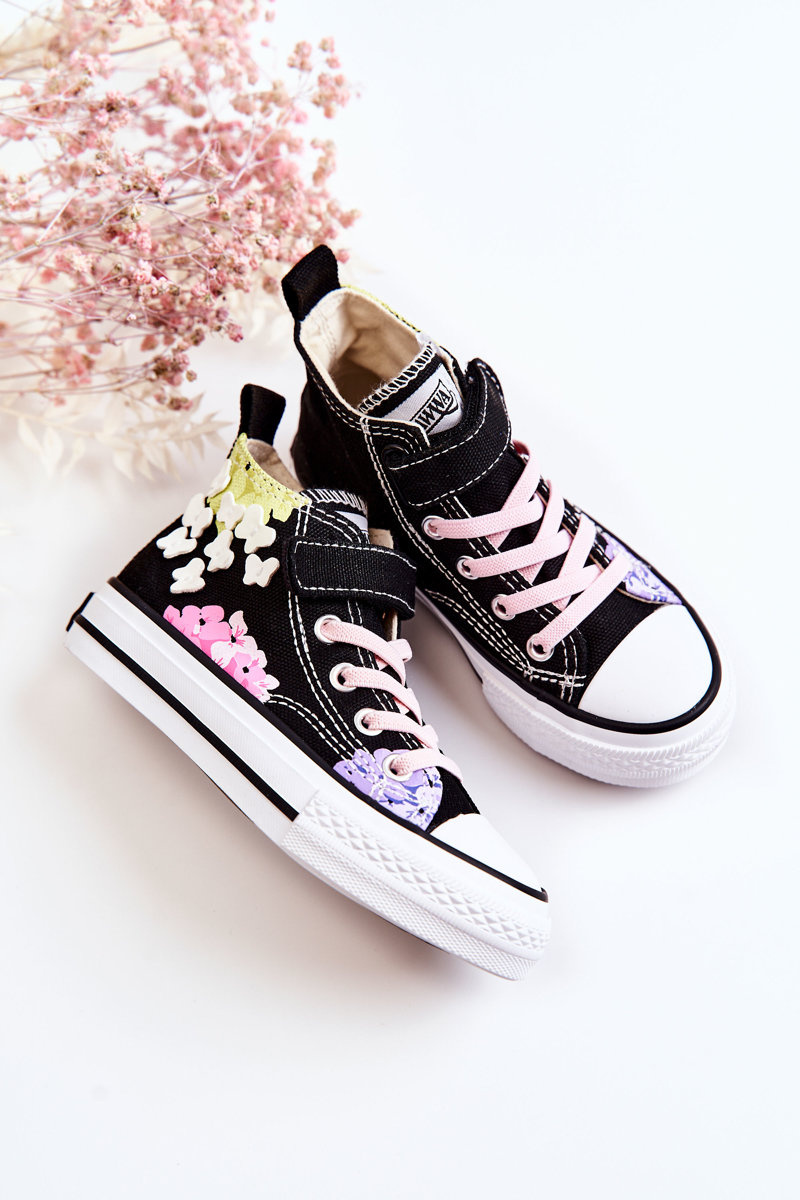 Great children's sneakers fastened with Velcro with elastic bands imitating laces. Made of textile material with a rubber reinforcement on the toe. Beautiful print and sewn butterflies on the side of the upper make these shoes look really wonderful. The soft insole made of fabric is removable and contoured. Sneakers have a slightly stiffened heel. The sole is made of rubber material, non-slip. When choosing a size, please use the size chart.