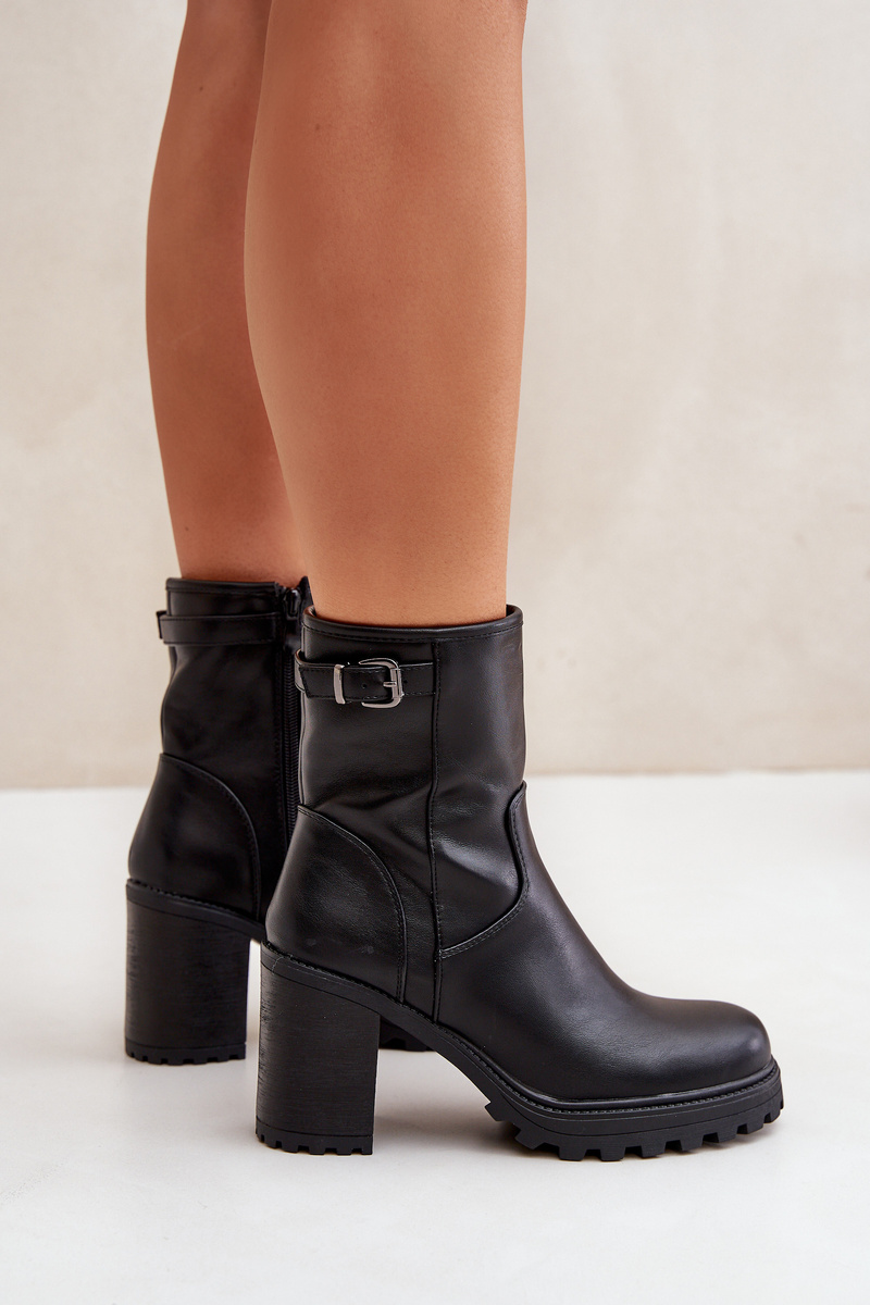Elegant women's ankle boots made of eco-leather, set on a stable block heel. The interior is insulated, making them an ideal choice for cold days. The upper part of the boot is adorned with a strap with a buckle, adding elegance and character. Perfect for both everyday wear and more formal occasions. When choosing a size, please refer to the size chart.