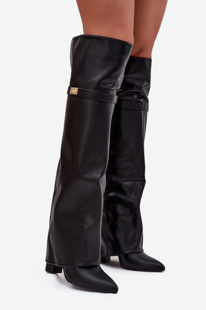 Women's boots with rolled-up shafts are a real hit of the upcoming autumn-winter season! The shaft reaches above the knee and overlaps the heel, giving them a unique character. Set on a stable block heel, they provide comfort and elegance, and the lining guarantees warmth on colder days. Slip-on and with pointed toes, they combine comfort with a fashionable, feminine style – perfect for creating striking winter outfits. When choosing your size, please refer to the size chart. When choosing a size, please refer to the size chart.