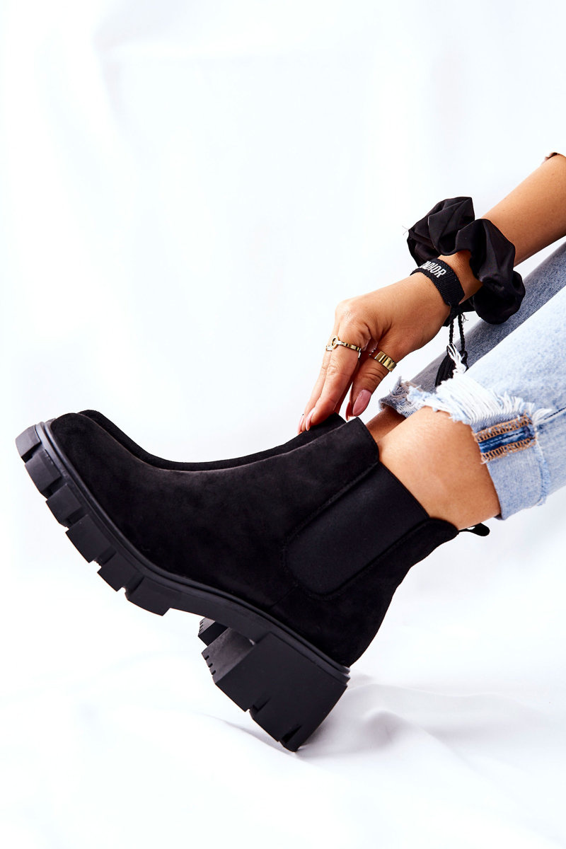 Women's boots made of nice-to-touch fabric eko suede type. The inside of the boots is insulated with a nice-to-touch shoe blanket. Zip fastening. Thick sole and massive heel ensure stability. Classic cut will match many stylisations! When choosing the size, please refer to the size chart..