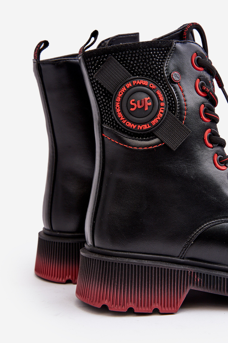These children's trappers are perfect for the autumn-winter season. Made of eco leather. Inside insulated with natural wool. This model is fastened with a zipper on the side and additionally has lacing. The boots are set on a flat heel and a delicate platform with grooves and an anti-slip sole. The toe is stiffened. This model should be in your child's wardrobe! When choosing a size, please refer to the size chart.