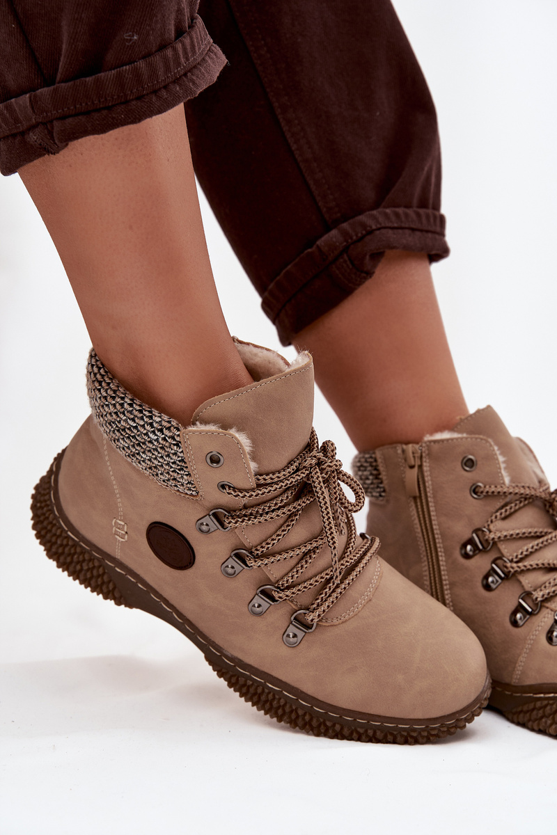 Women's trapper boots made of eco-leather. The model features a zipper and laces, providing comfort and the ability to perfectly fit the foot. The interior is lined with soft fur to guarantee thermal comfort, and the rounded toes highlight the classic character of the footwear. The sole made of rubbery material ensures good grip and stability on various surfaces. An additional accent is a small patch placed on the side of the upper. These boots are perfect for winter walks and everyday outings. When choosing the size, please refer to the size chart. When choosing a size, please refer to the size chart.