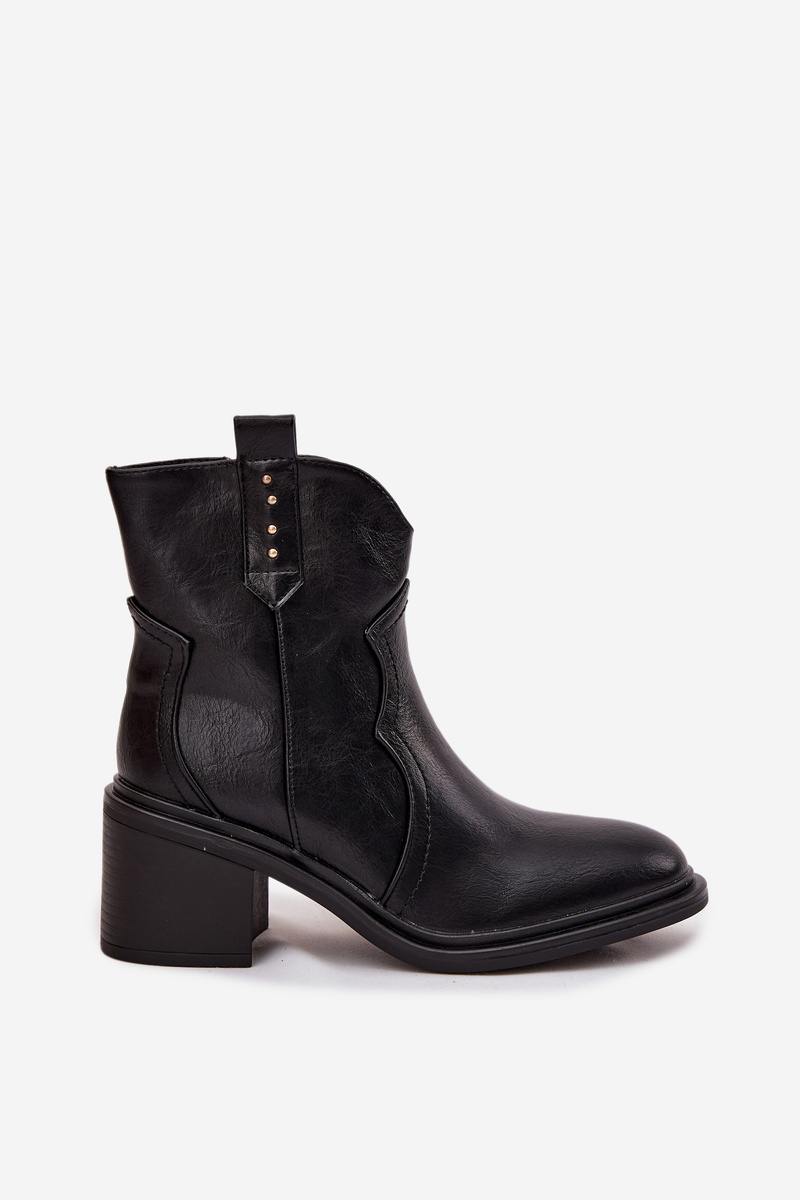 Women's cowboy-style ankle boots made from eco leather are a choice for women who value a combination of comfort and fashionable appearance. The model is based on a chunky, stable heel that adds height to the silhouette while ensuring walking comfort. Rounded toes. Fastened with a zipper, easy to put on and take off, and lined with soft shoe fleece to keep warm on colder days. These stylish boots perfectly match current trends – ideal for both jeans and dresses or skirts, creating a fashionable, feminine look. Please refer to the size chart when choosing your size. When choosing a size, please refer to the size chart.