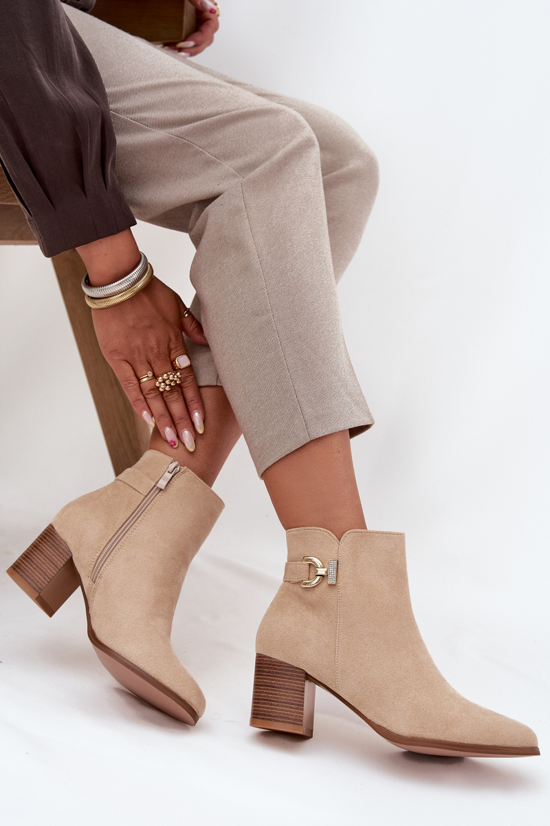 Women's ankle boots made of eco suede are an elegant choice for colder days. Set on a stable block heel, they provide comfort and a confident step, and the interior lined with soft fur guarantees warmth. Rounded toes give them a gentle, feminine character, and a zipper makes them easy to put on. The gold detail on the side of the shaft adds a subtle, stylish accent that perfectly complements both casual and more elegant outfits. Please refer to the size chart when choosing your size. When choosing a size, please refer to the size chart.