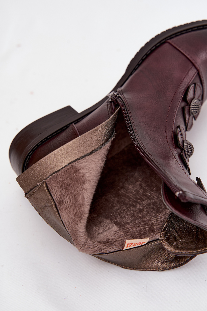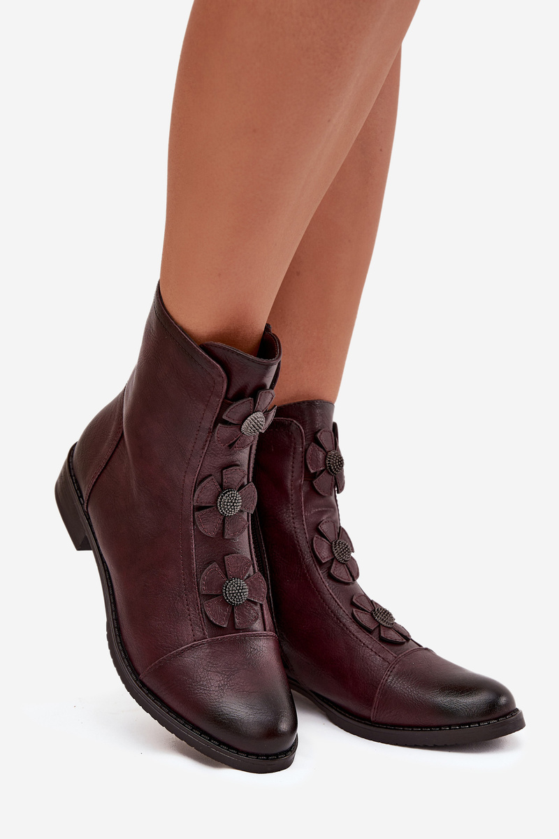 Insulated women's ankle boots with flat heel and decorative flowers Bordeaux Pravienne