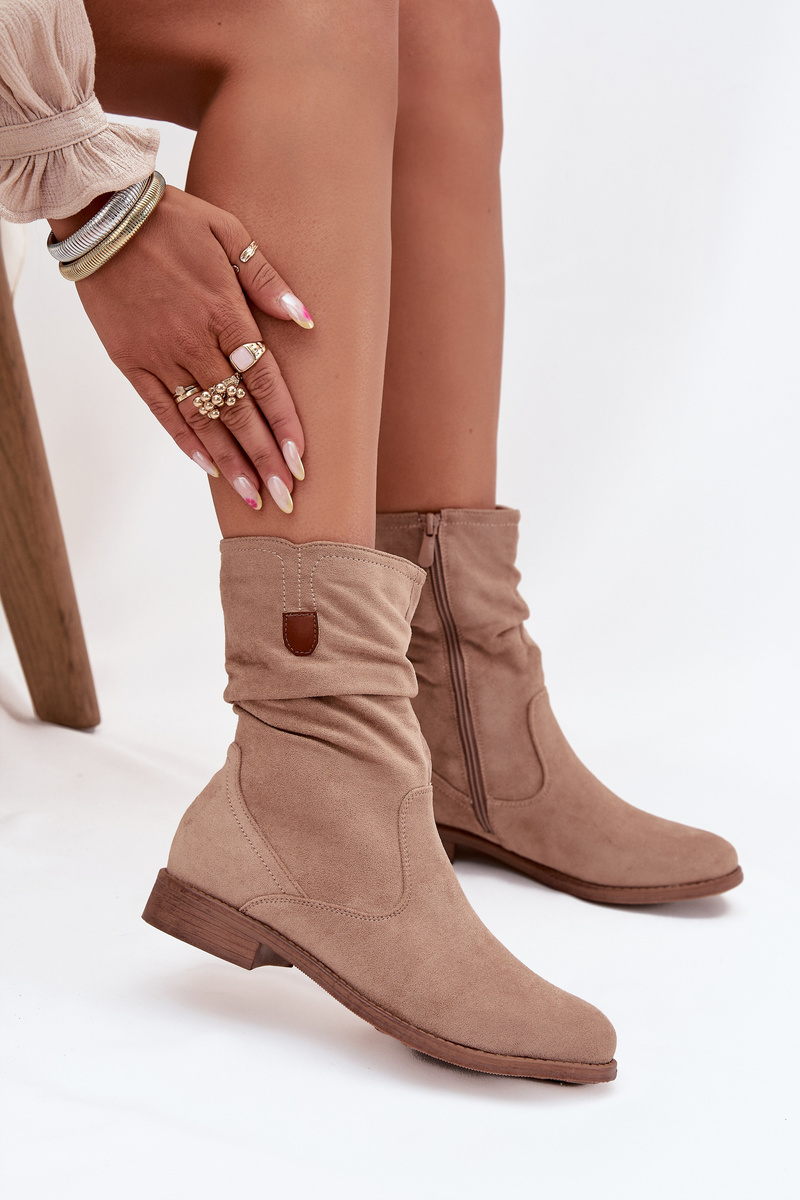 Women's ankle boots made from eco suede. The flat heel provides all-day comfort, and the ruched shaft adds a subtle, fashionable touch. The zipper makes putting them on easy, and the lining guarantees warmth and comfort. Perfect for everyday outfits. Please refer to the size chart when choosing your size. When choosing a size, please refer to the size chart.