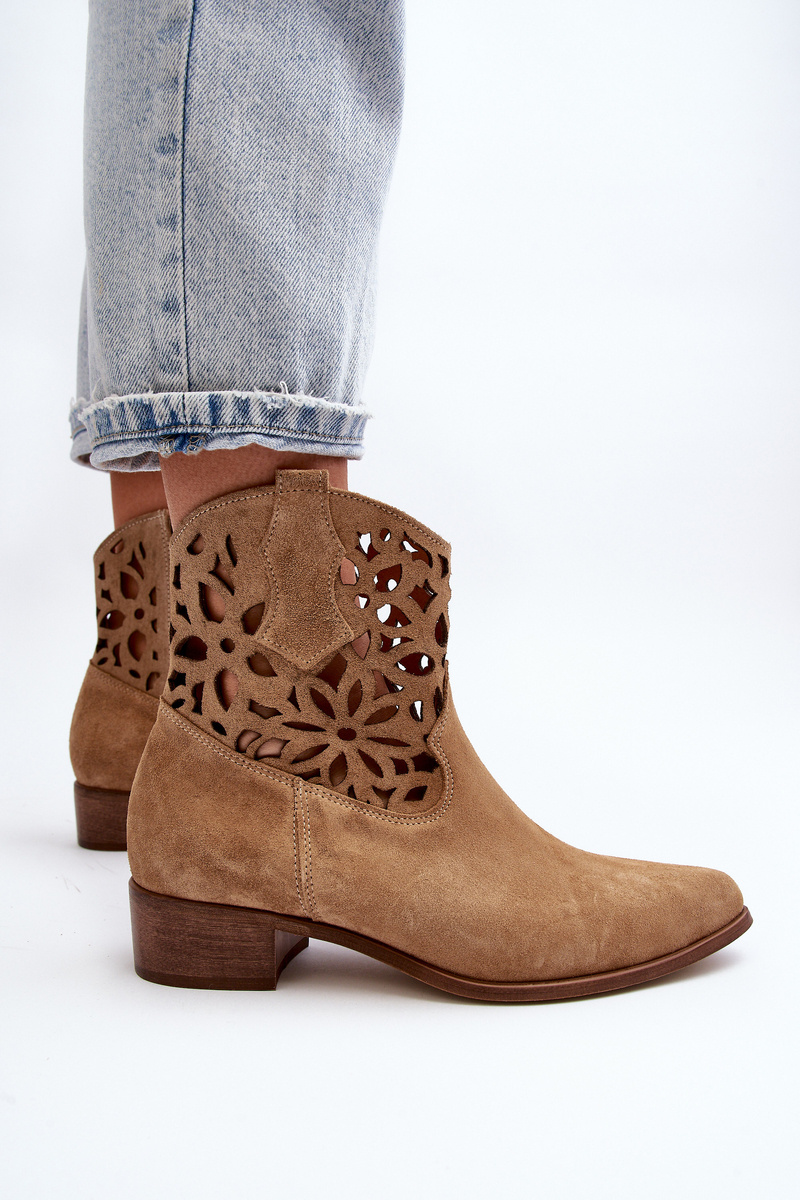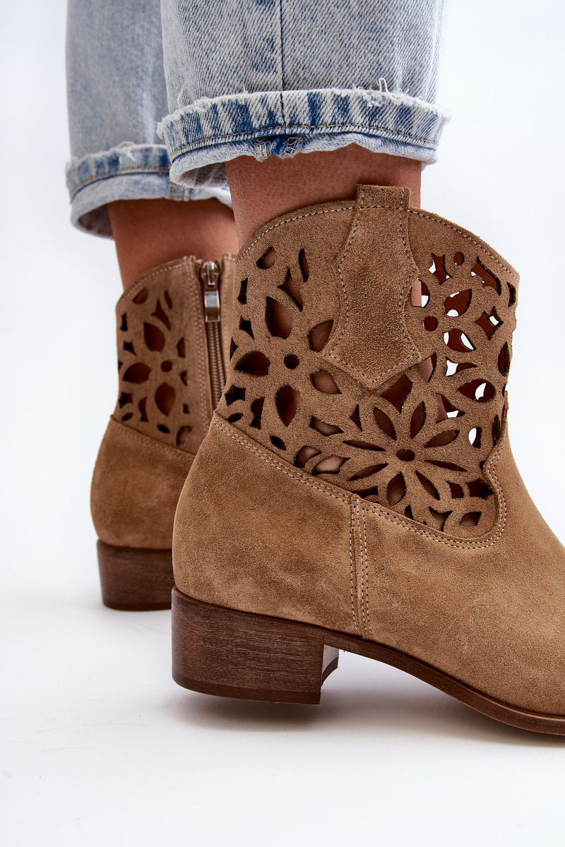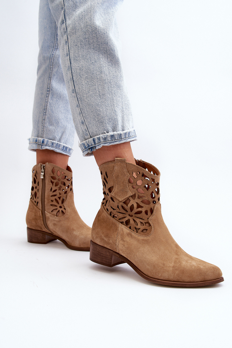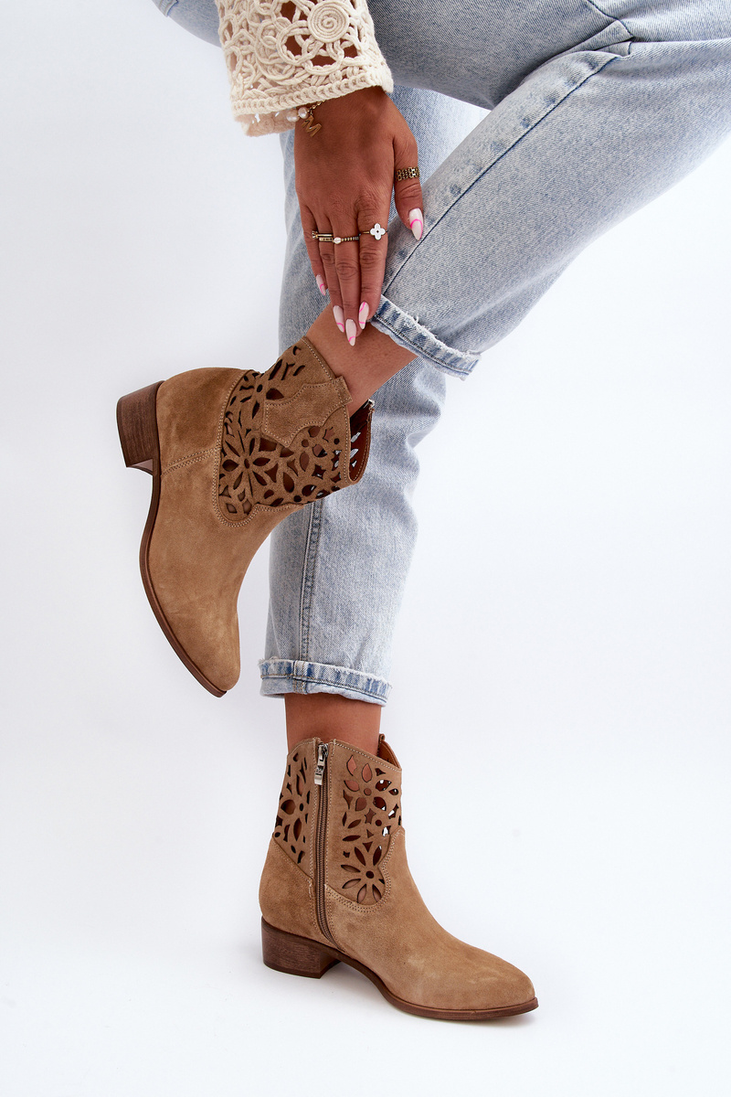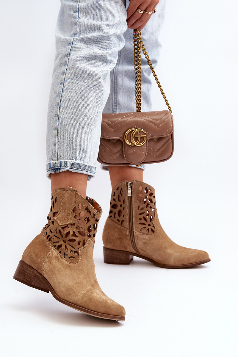 Women's boots made of natural suede. Set on a low heel, which makes them both stylish and comfortable. The latticed pattern on the uppers adds elegance to them. This model is fastened with a zipper, which makes it easy to put on. The soft insole ensures comfort when wearing. When choosing a size, please refer to the size chart.