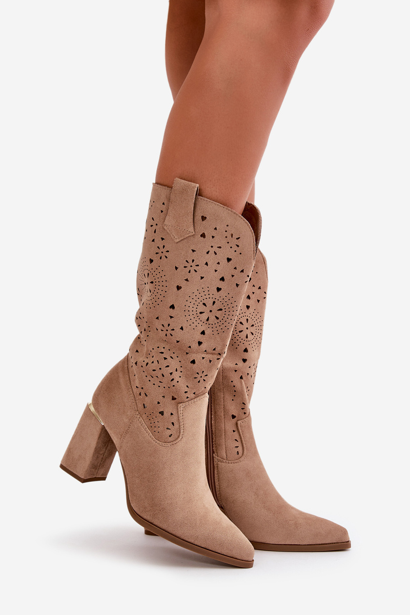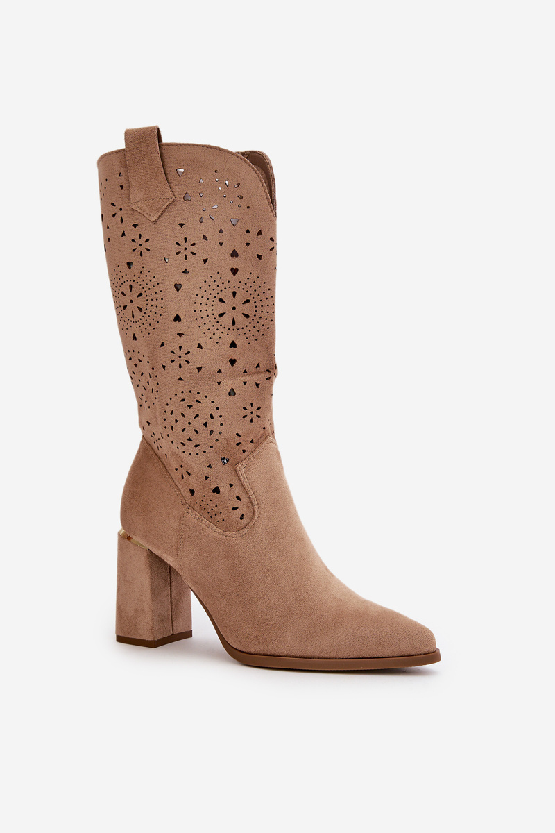 Women's ankle boots made of soft-touch eco suede. They have a latticed upper reaching to mid-calf. Set on a column heel with a mirrored accent. Fastened with a zipper, with pointed toes. This fashionable and elegant style will be the perfect complement to many outfits! When choosing a size, please refer to the size chart.