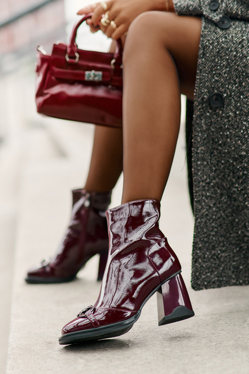 Lacquered ankle boots on a heel insulated with decoration D&A MR880-021 burgundy