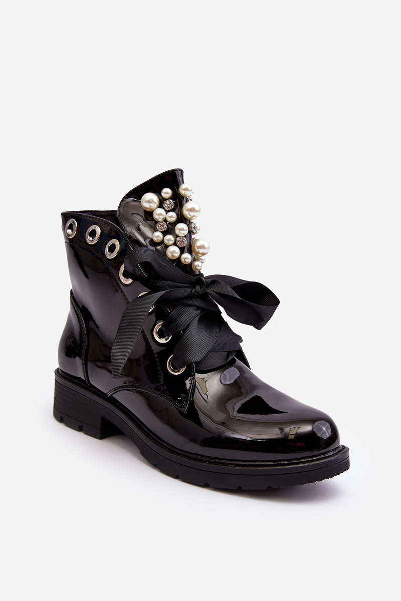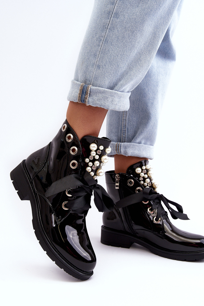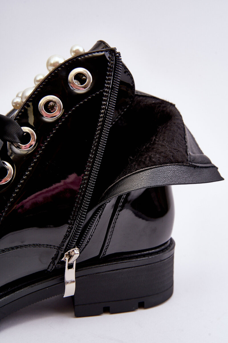 Fashionable women's ankle boots on a flat, stable heel. Made of eco leather. This model is fastened with a zipper on the inside of the shaft and additionally has laces. On the front decoration in the form of artificial pearls and rhinestones. The interior is insulated with a shoe lining. The toe is stiffened. They will be great for many styling! When choosing a size, please refer to the size chart.