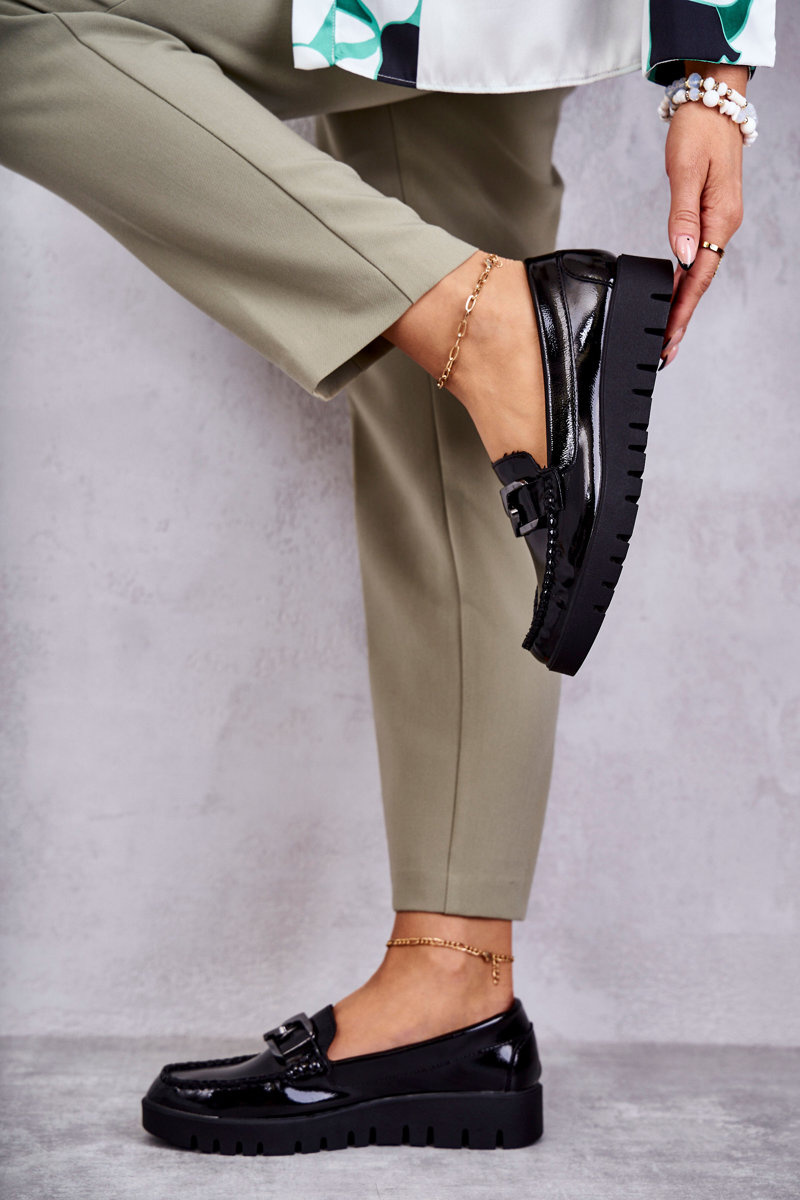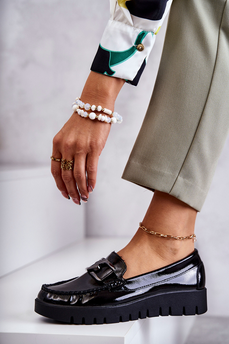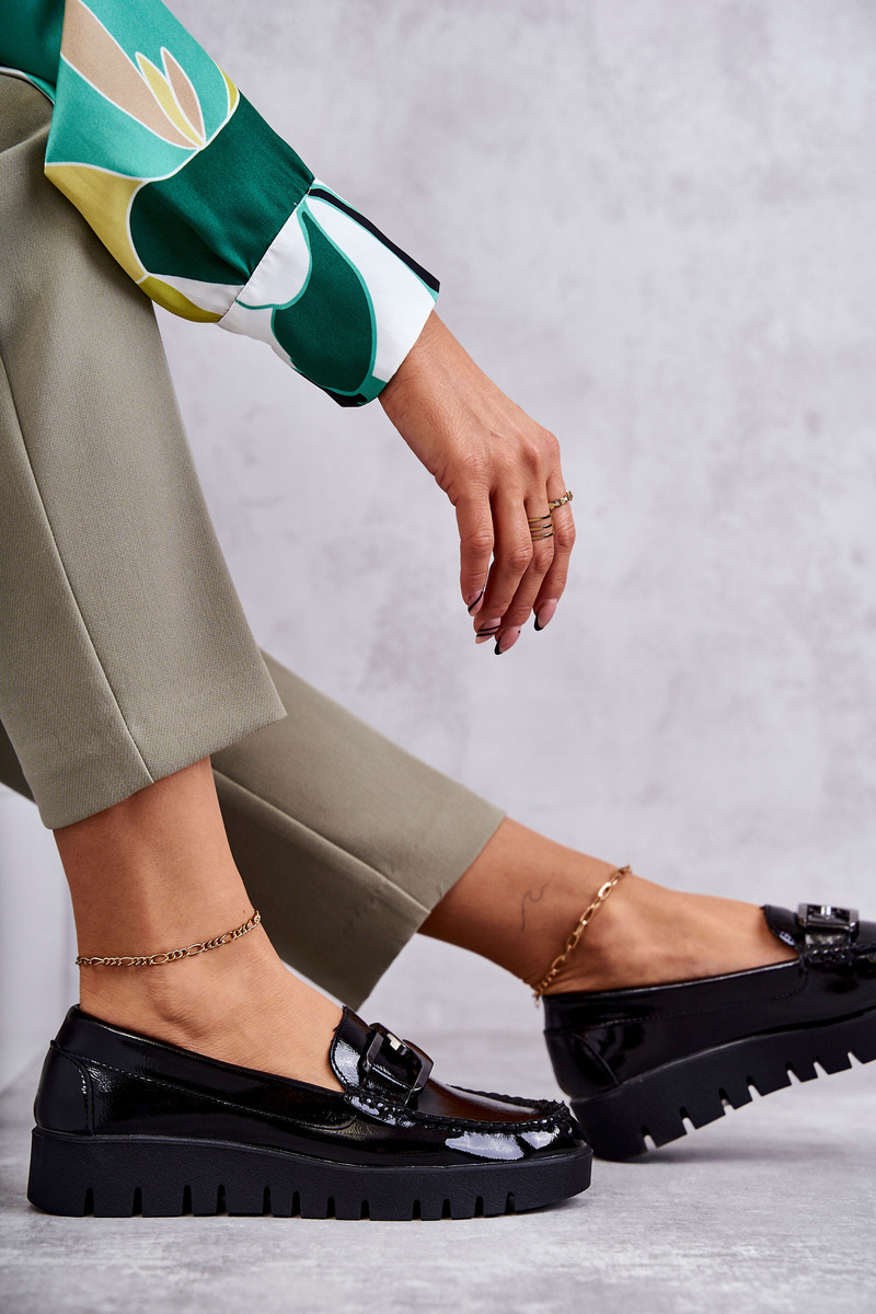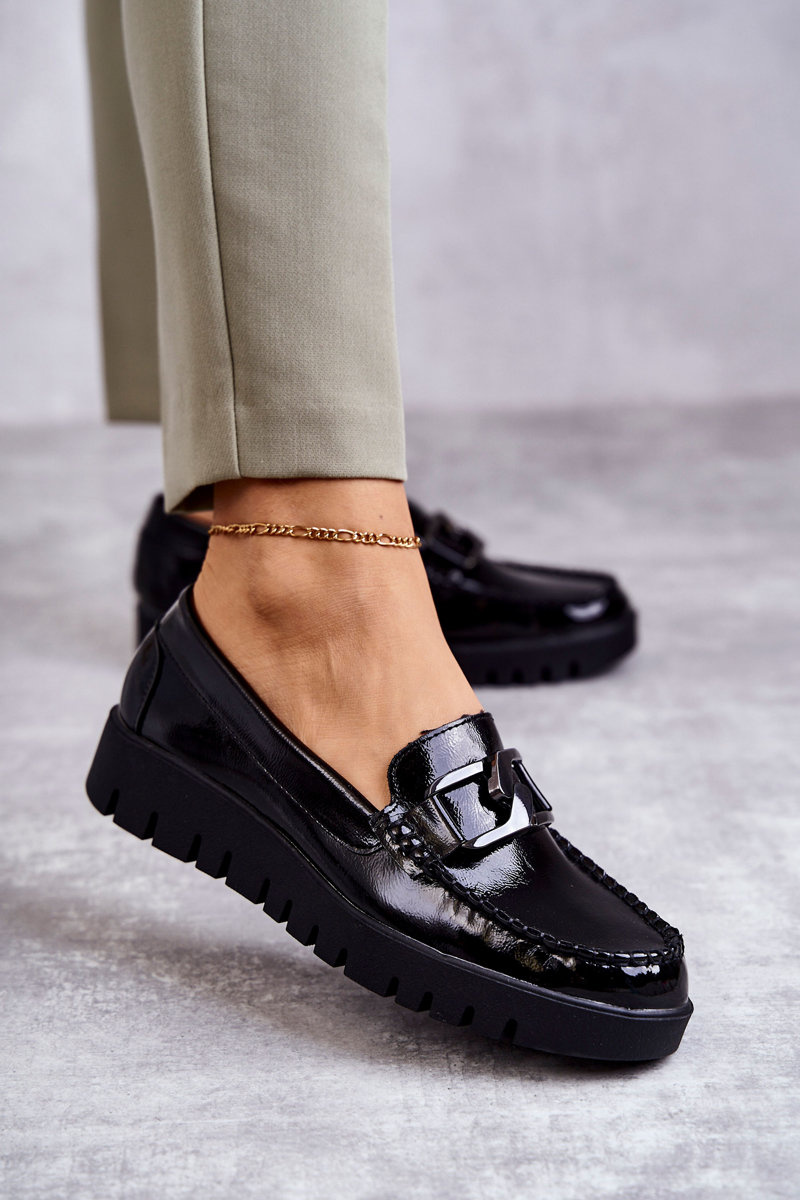 Classic shoes are an excellent choice for work styling. They look great with both trousers and a skirt. Plastic decoration beautifully emphasizes the whole. The shoes have a massive sole with a distinct groove. Lacquered eco leather is a practical choice for everyday use. Loafers shoes are shoes that must be in your wardrobe! When choosing a size, please use the size chart.