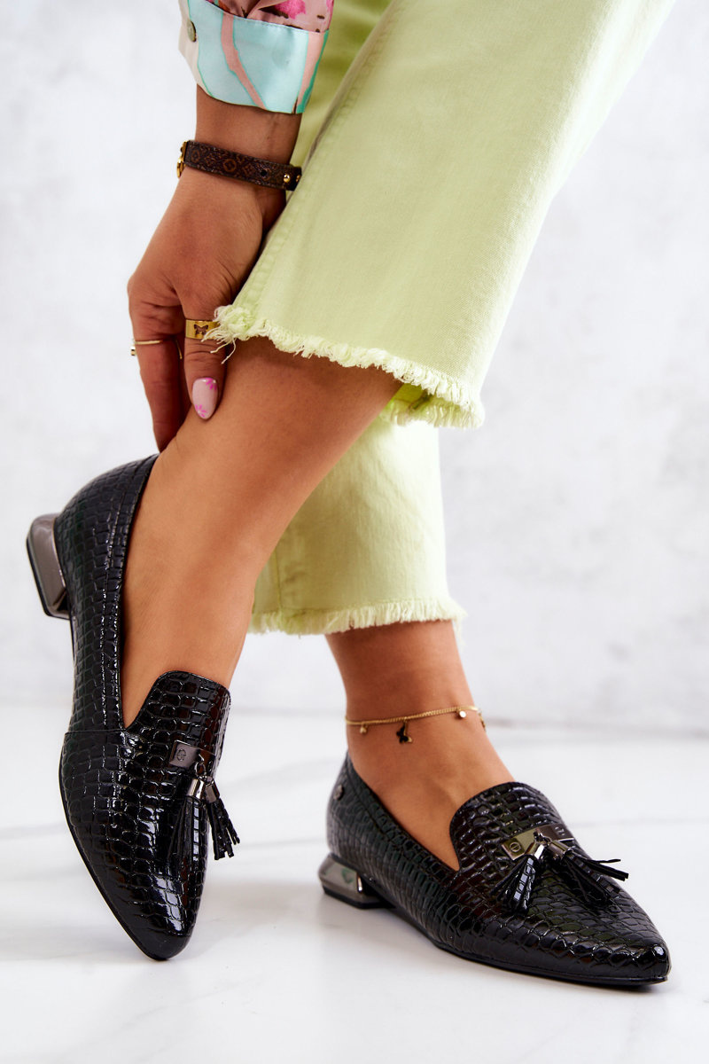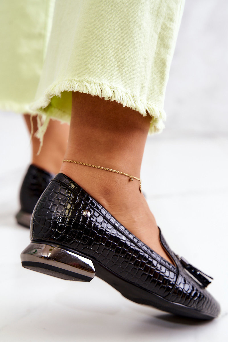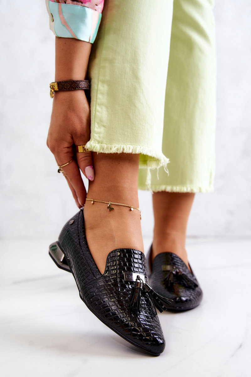 Lacquered Moccasins Crocodile Pattern With Fringes Black Pharell