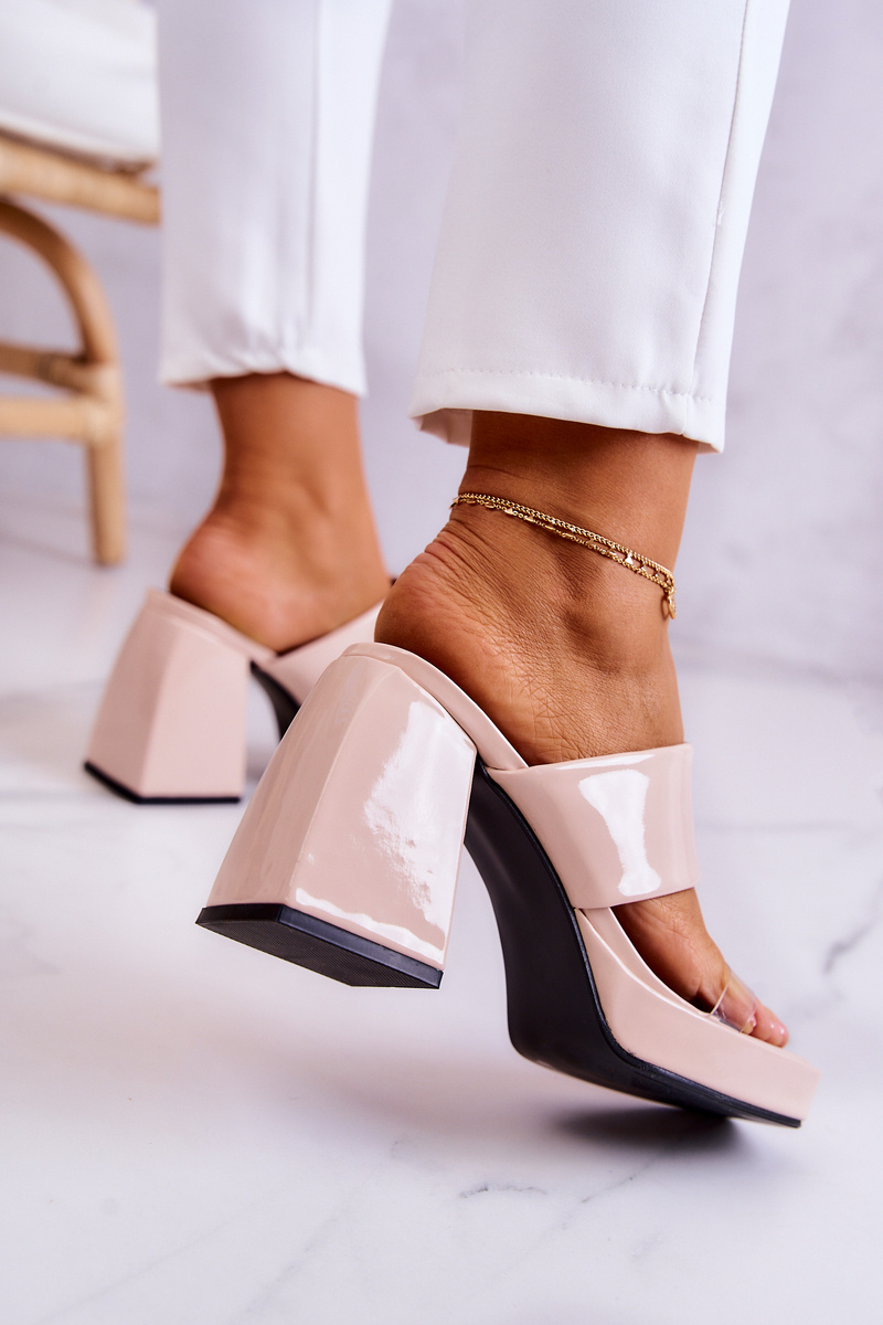 Slippers on a unique, wide heel in the form of a post. The front is mounted on a platform with an open, square toe. Two straps support the foot. Classic, slip-on model with an open heel. Made entirely of eco leather. They have a soft, eco leather insole. You will surely impress many people in these shoes! Stylish, comfortable to use and stable. This model should be just with you! When choosing a size, please use the size chart.