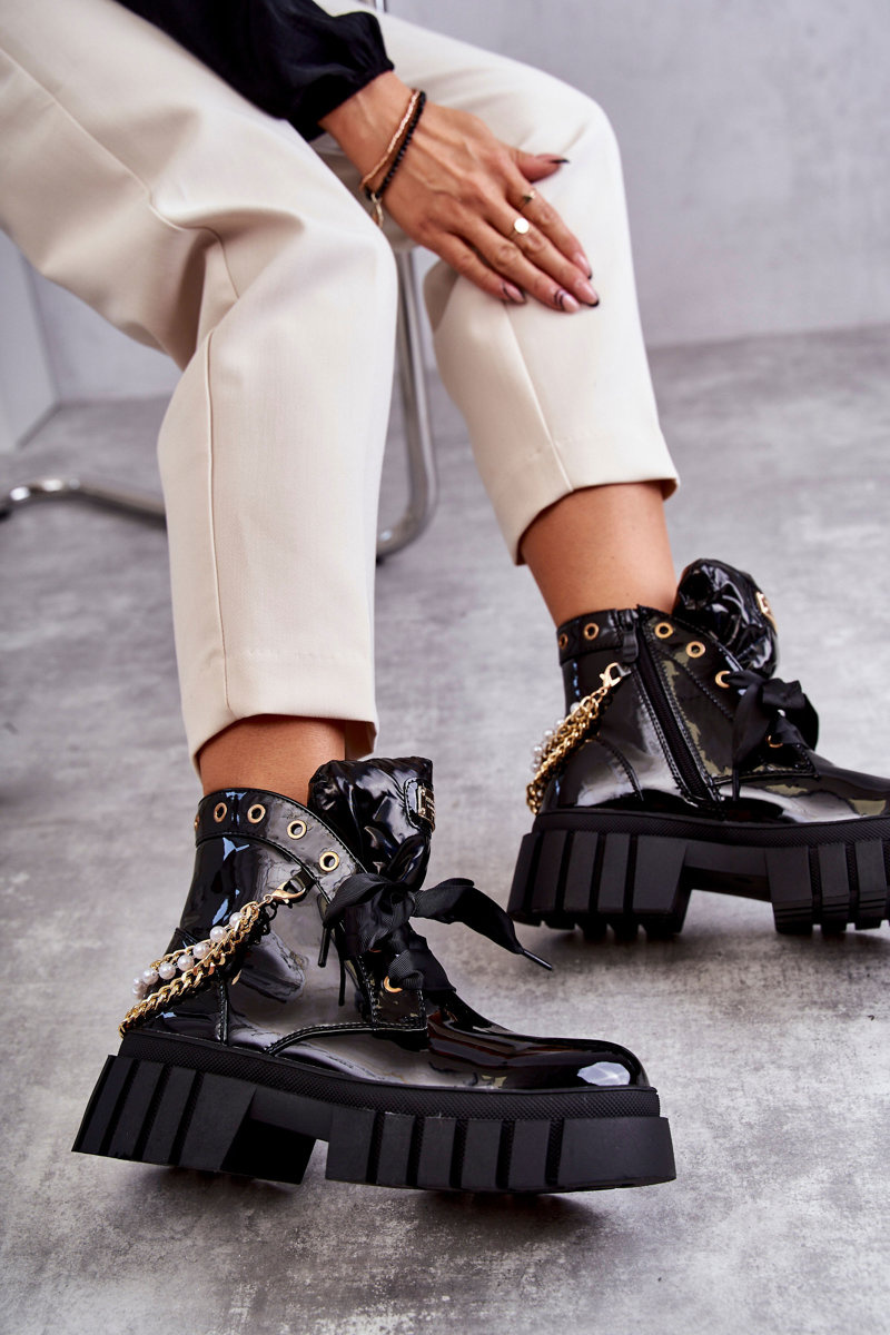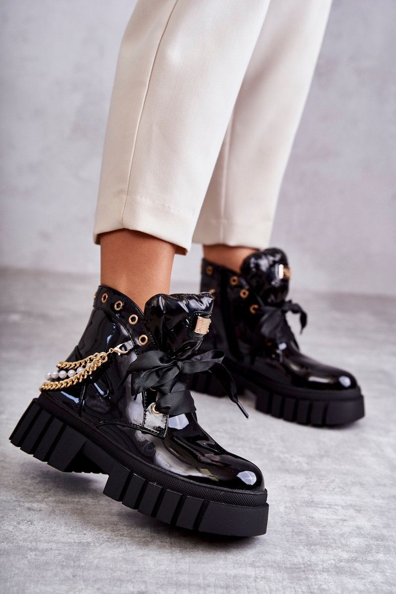Women's boots are the perfect choice for the transitional season. Made of varnished eco leather. They have jets on the laces and on the tongue. Additionally, the heel counter is stiffened. The shoes are insulated in the form of a shoe blanket. The boots are mounted on a flat heel and a platform with grooves. This model must be yours! When choosing a size, please use the size chart.