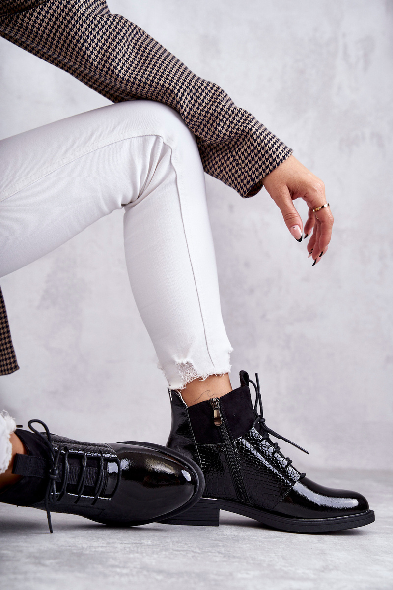 Women's boots with uppers made of combined materials. The boots are decorated with eco leather with snakeskin embossing. Classic laced model. These shoes were mounted on a flat heel. The inside insulated with a shoe blanket will make cold days no longer so terrible! This model should be yours, because it will perfectly complement any autumn styling. When choosing a size, please use the size chart.