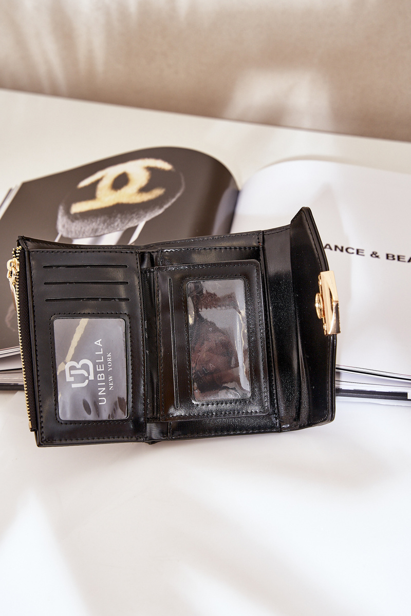 Women's wallet made of patent eco leather. This model features a coin pocket with a zipper. Inside, there is a section for banknotes and cards. The wallet closes with a magnet. A classic design that will surely appeal to every woman!