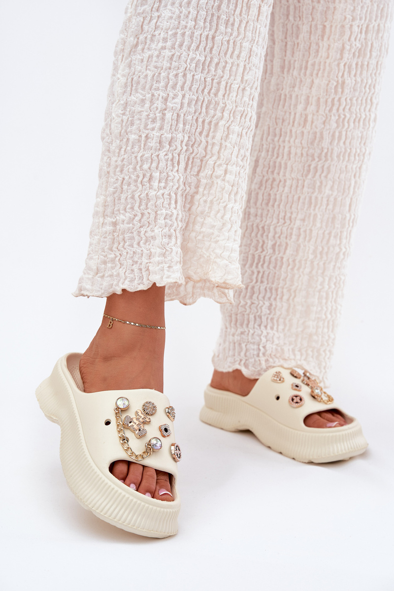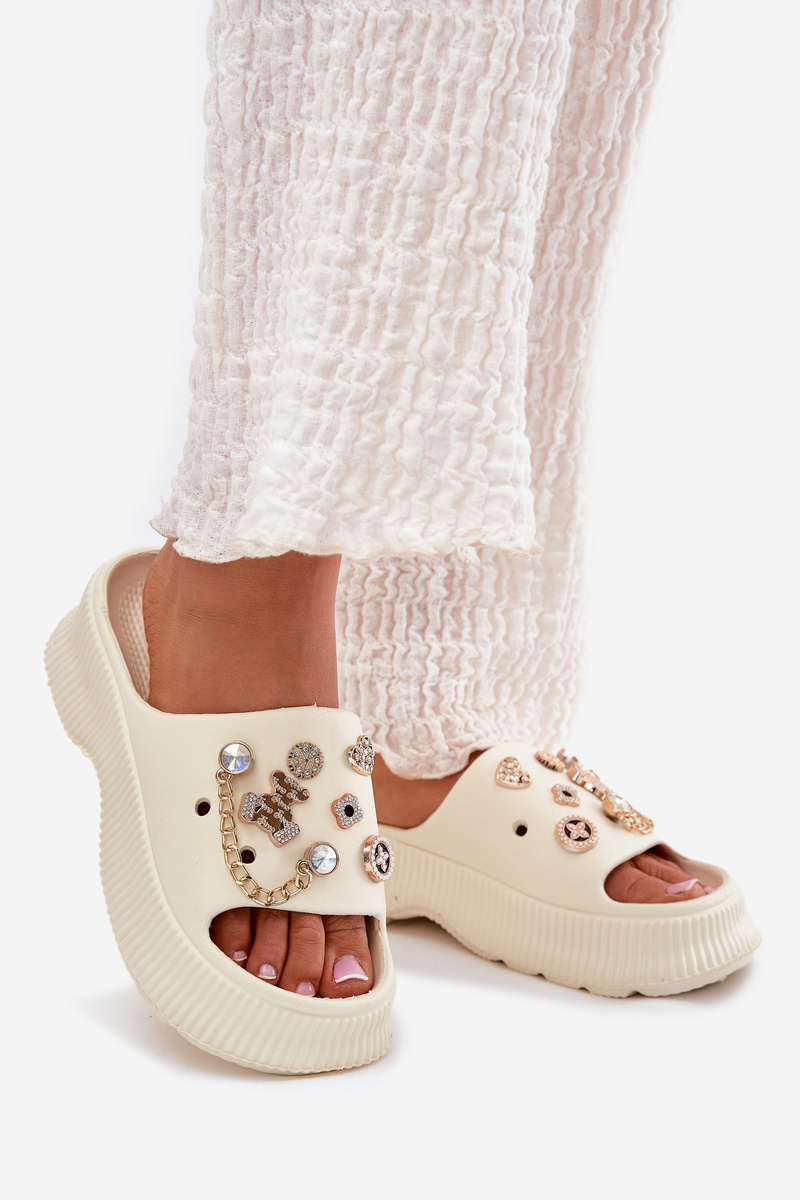 Women's foam slides, set on a platform, are a stylish choice for warm days. Golden, cute pins on the strap give them a fashionable character. Perfect for summer trips, days by the pool, or at the beach. When choosing a size, please refer to the size chart.