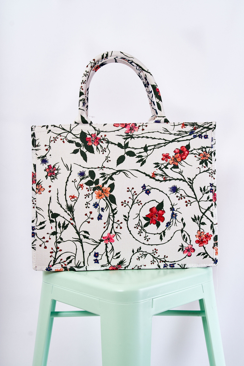 A stiff, large handbag with a beautiful pattern. The bag will be a great addition to spring and summer stylizations. Made of textile material. Composition: 50% polyester, 50% cotton. The compartment is closed with a zipper. Additionally, the bag comes with a detachable, adjustable strap. In the middle there are two smaller, open pockets and one larger with an elastic band. The bag also has a reinforced bottom inside.