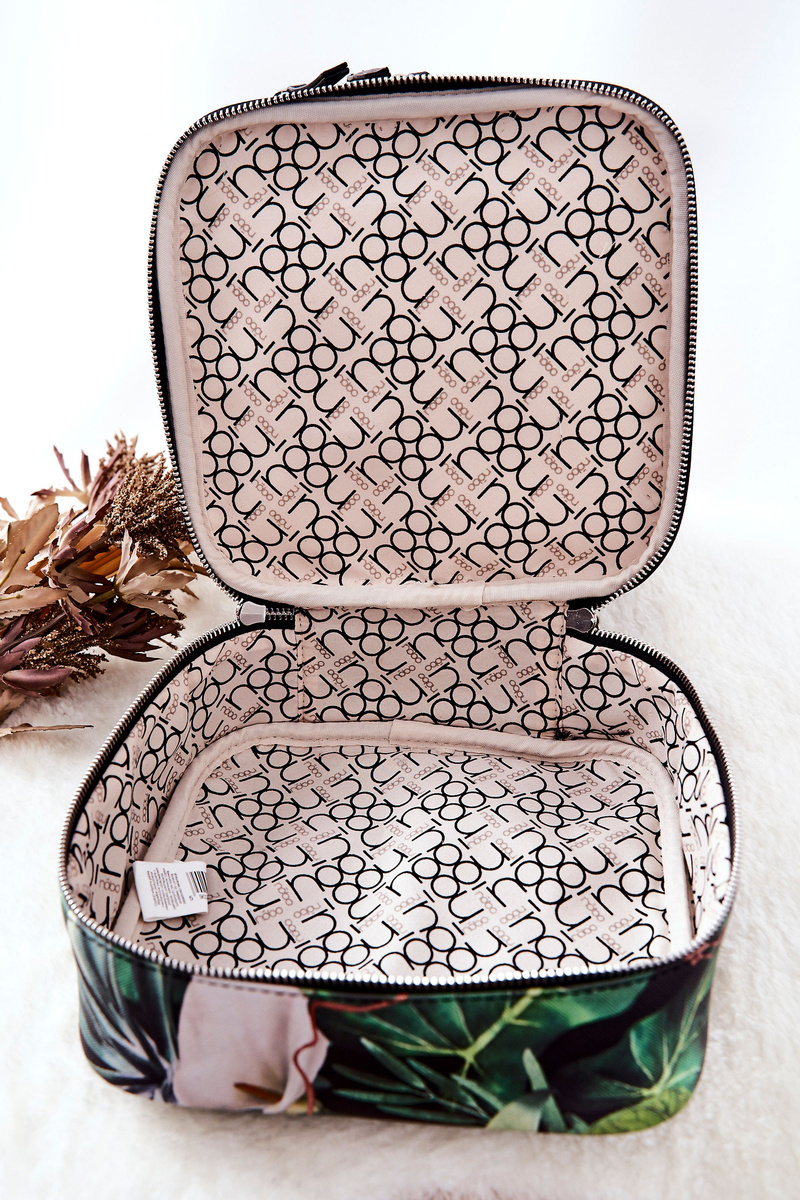 The cosmetic bag is made of eco-leather with a beautiful print. It can also serve as a trunk. It has three zippers, thanks to which we have convenient access to the contents. In the upper compartment there is an open pocket with an elastic band and a separate elastic band to hold cosmetics. In the middle compartment you can loosely place various small items. The lower pocket is deeper than the middle one and also has no pockets or elastics, like the middle compartment. The entire inside is trimmed with NOBO brand logo fabric.