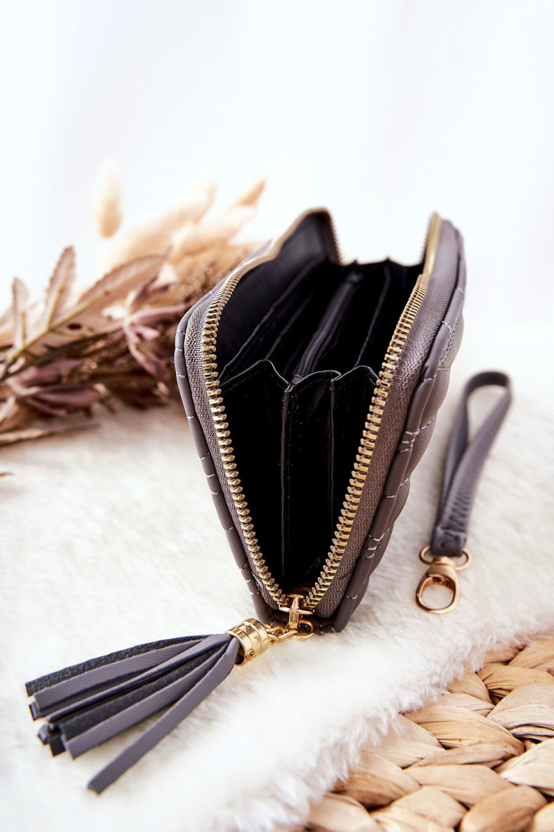 Velká peněženka se zapínáním na zip na vnější straně. Vnější strana je vyrobena z prošívané ekokůže. Na zipu je připevněn střapec. Součástí balení je také opasek. Vnitřní prostor na mince, bankovky a vizitky. Nezapomeňte se podívat na naše další peněženky!