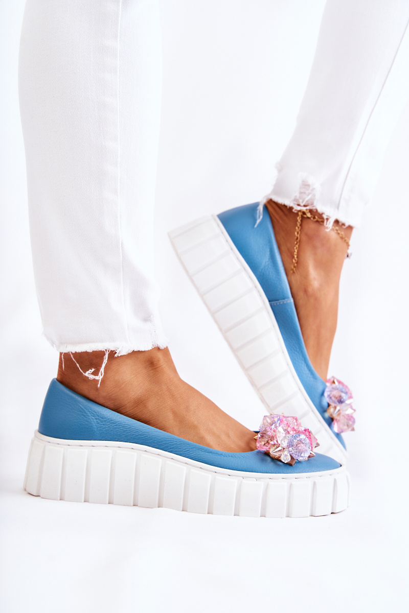 Leather Ballerinas On A Platform With A Ornament Blue and White Ladette