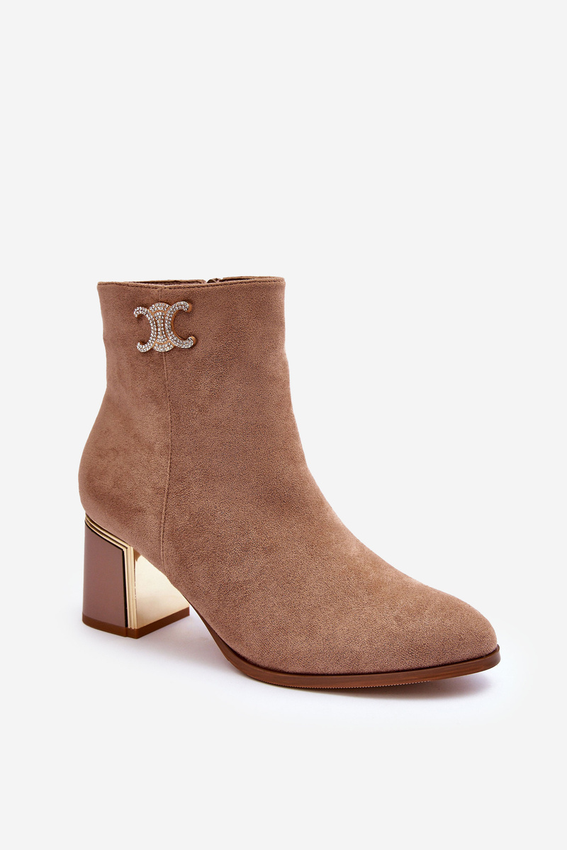 Women's ankle boots. Made of soft to the touch eco suede. Set on a stable heel. Fastened with a zipper on the inside. On the heel there is a mirror element and a jewelry decoration on the top of the shaft. The toe is stiffened, the inside is insulated with a shoe lining. When choosing a size, please refer to the size chart.