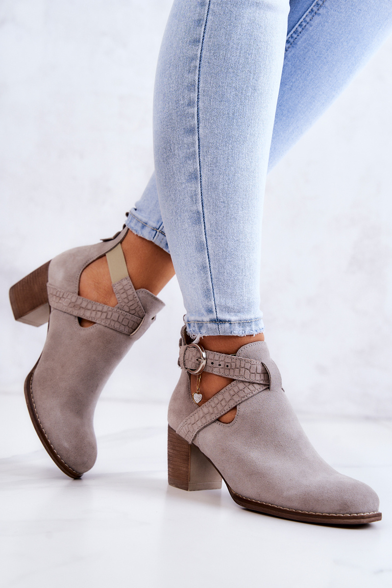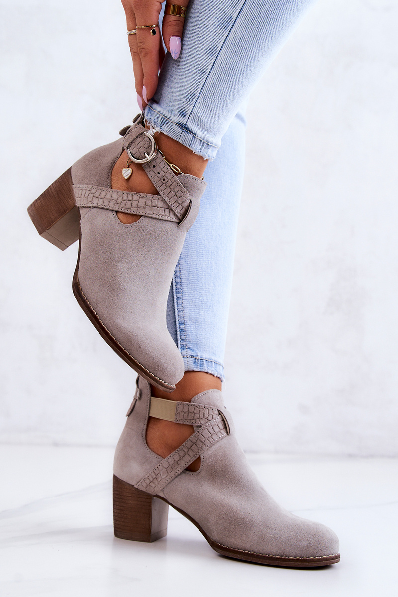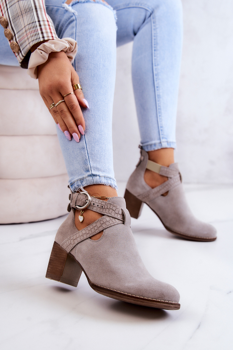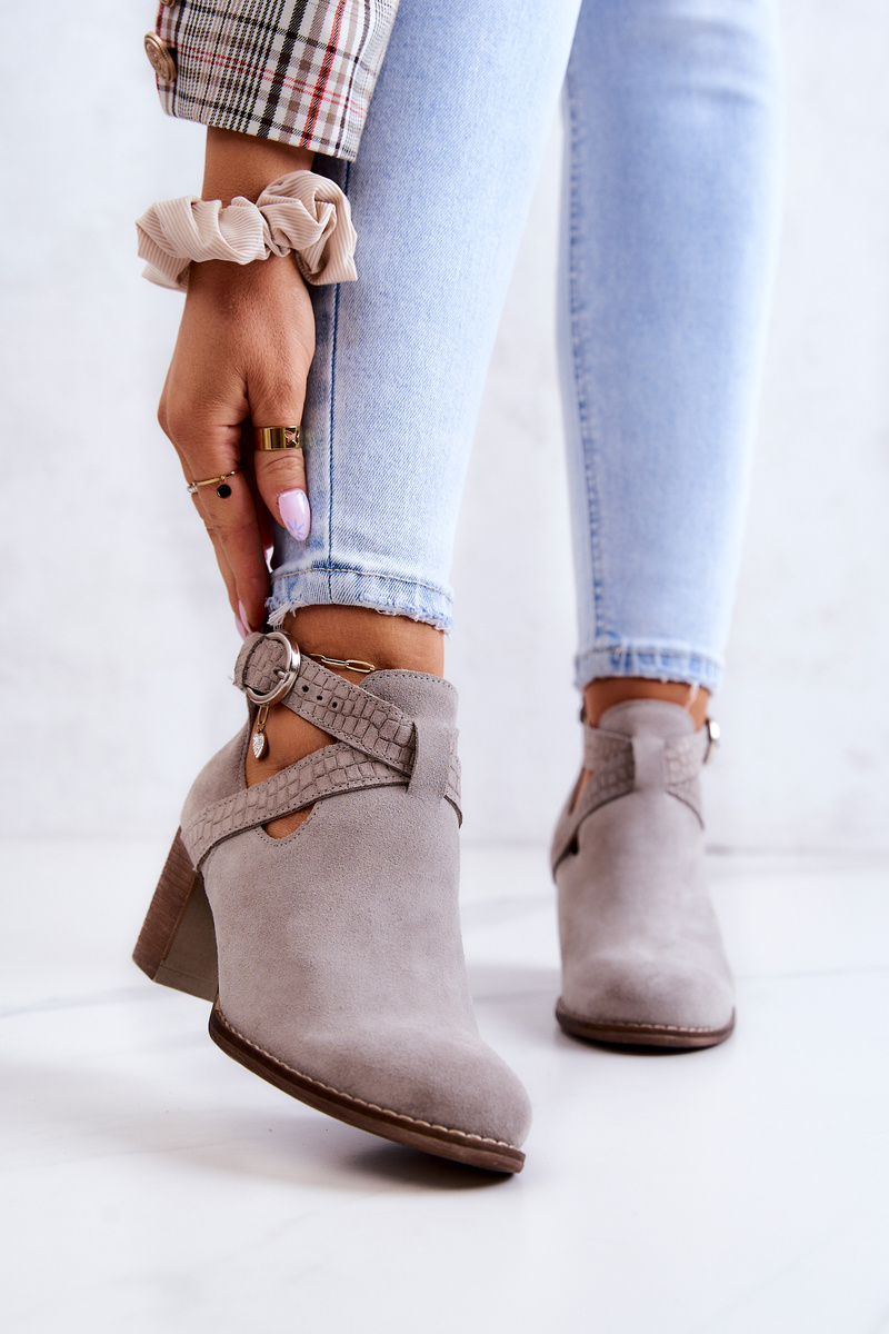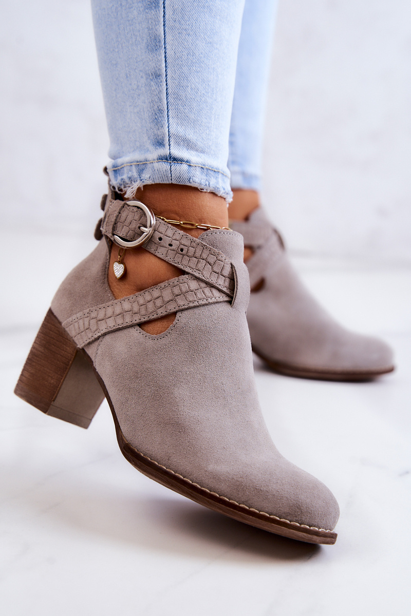 Boots made of natural suede leather with cuts on the sides of the upper. The insole is made of natural leather, which makes them very comfortable during use. On the side of the upper there is also an adjustable strap fastened with a buckle and an elastic band. Heel in the form of a post. Embossed texture and a fashionable cut make these shoes look really special. Closed, rounded toe. Be sure to also check out the other models of leather shoes available in our offer! When choosing a size, please use the size chart.