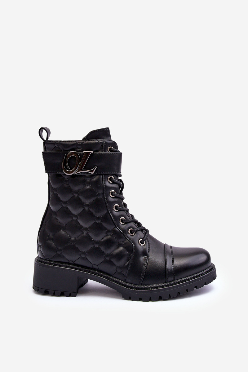 Fashionable women's boots made of eco leather. Set on a platform and a flat, stable heel. On the upper there are numerous stitches and a decoration on the strap. Fastened with a zipper on the inside and additionally laced. The inside is lined with a shoe blanket. The perfect model for autumn outfits! When choosing a size, please refer to the size chart.