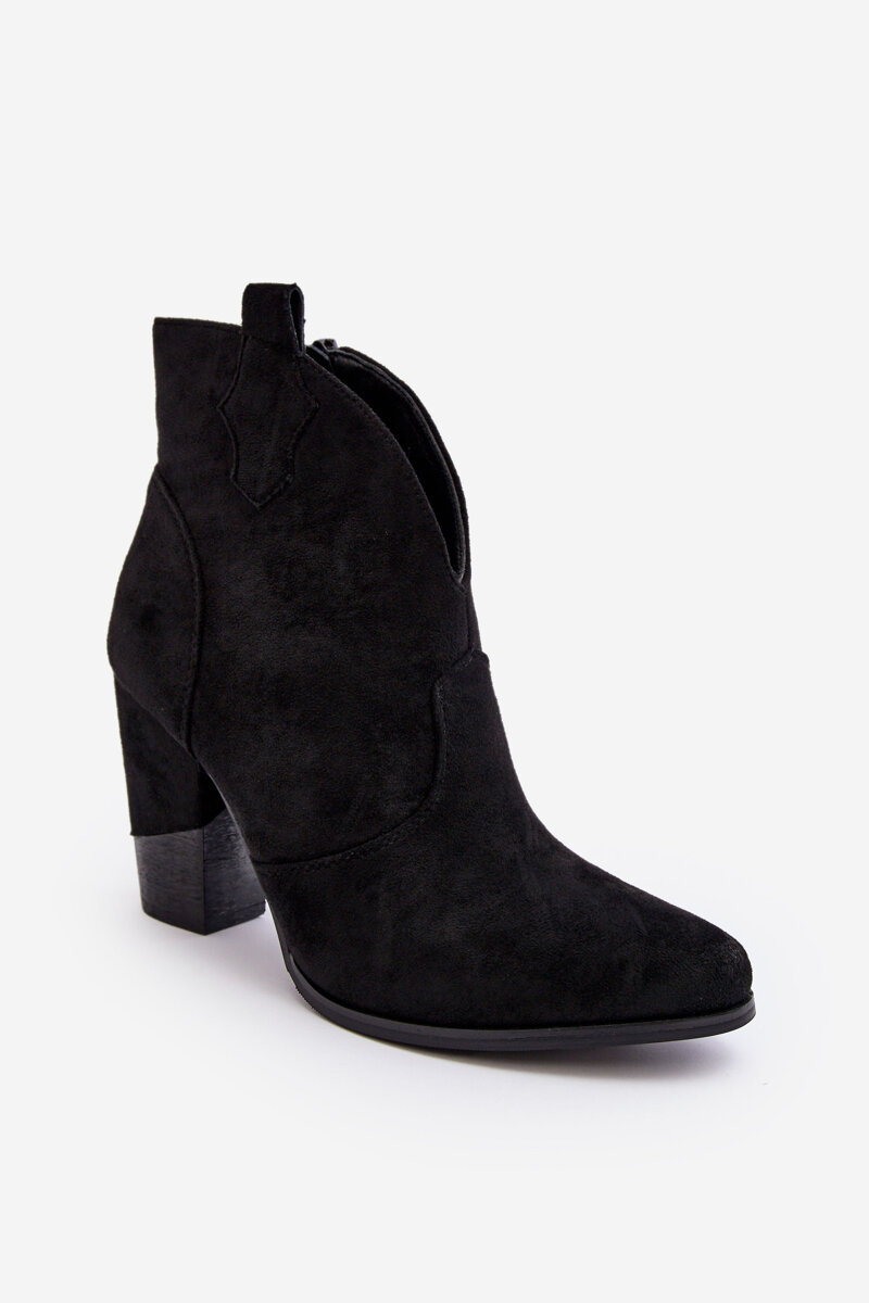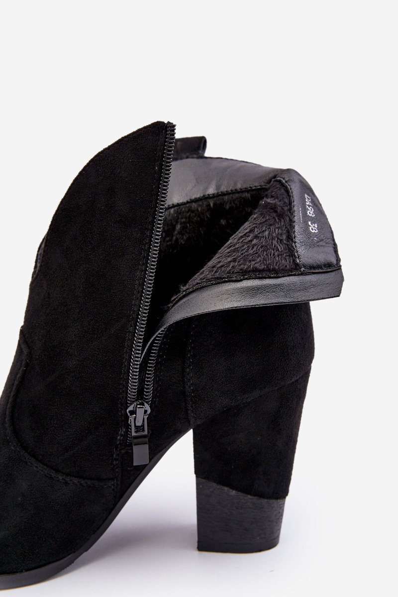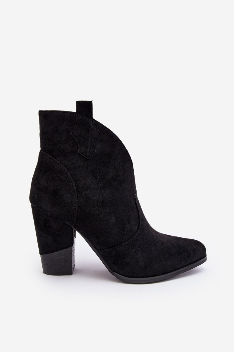 Cowboy-style boots have been made of eco suede. Set on a heel in the form of a column. Fastened with a zipper on the inner side. Pointy toes will optically slim the legs. The inside is insulated with a shoe blanket. This model will be the perfect complement to autumn-winter outfits! When choosing a size, please refer to the size chart.