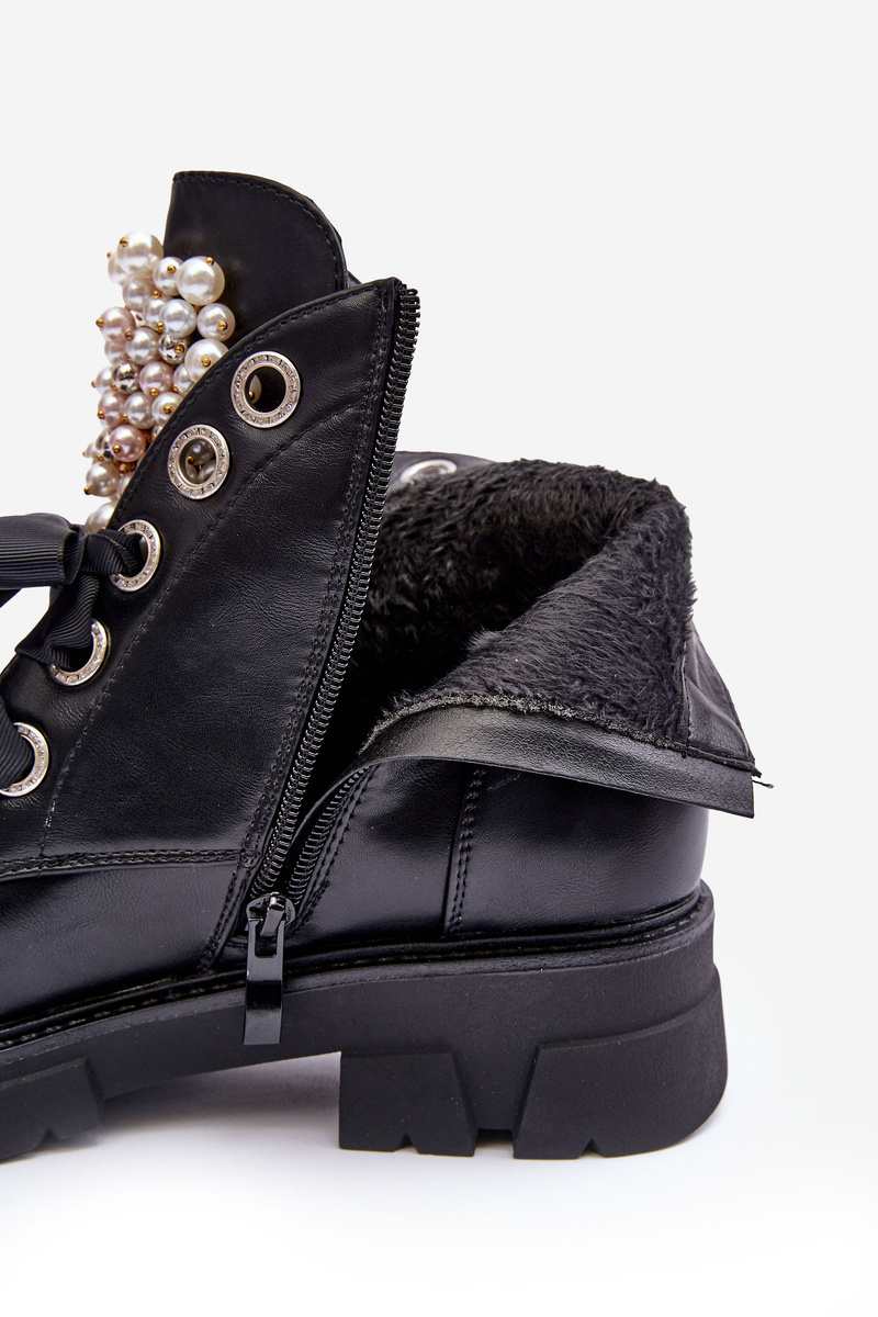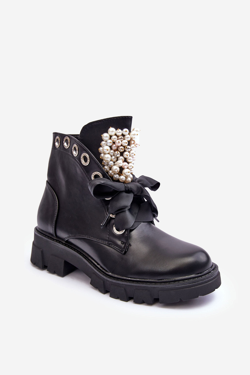 Low ankle boots set on a flat heel and platform. Made of eco leather. Decorated with beads on the front. Fastened with a zipper on the side and additionally have lacing. The inside is insulated with a shoe blanket. Toes rounded. When choosing a size, please refer to the size chart.