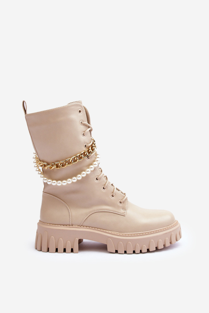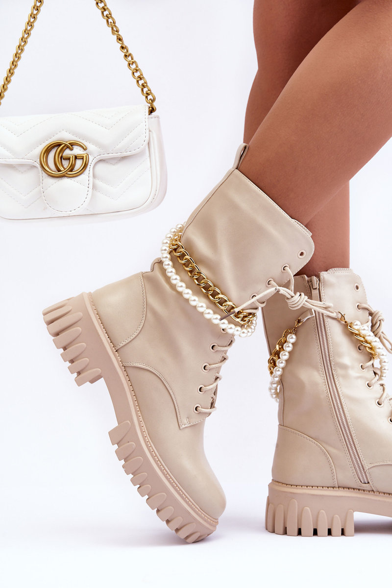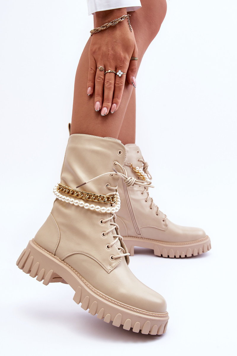 Trendy women's ankle boots made of eco leather. This model has a zipper closure and additional lacing that allows for proper adjustment of the shaft to the thickness of the leg. In addition, the toe of this shoe is stiffened. The shoes have a chain and artificial pearls that can be detached. Don't hesitate and buy today! When choosing a size, please refer to the size chart.