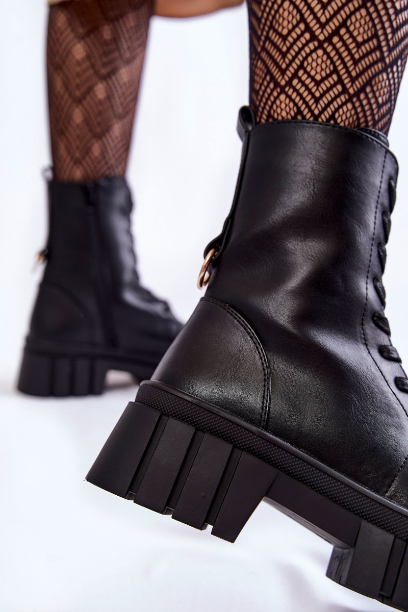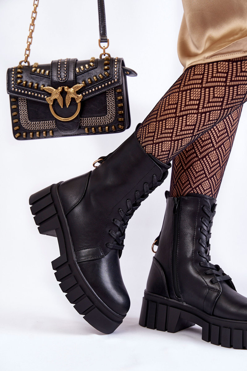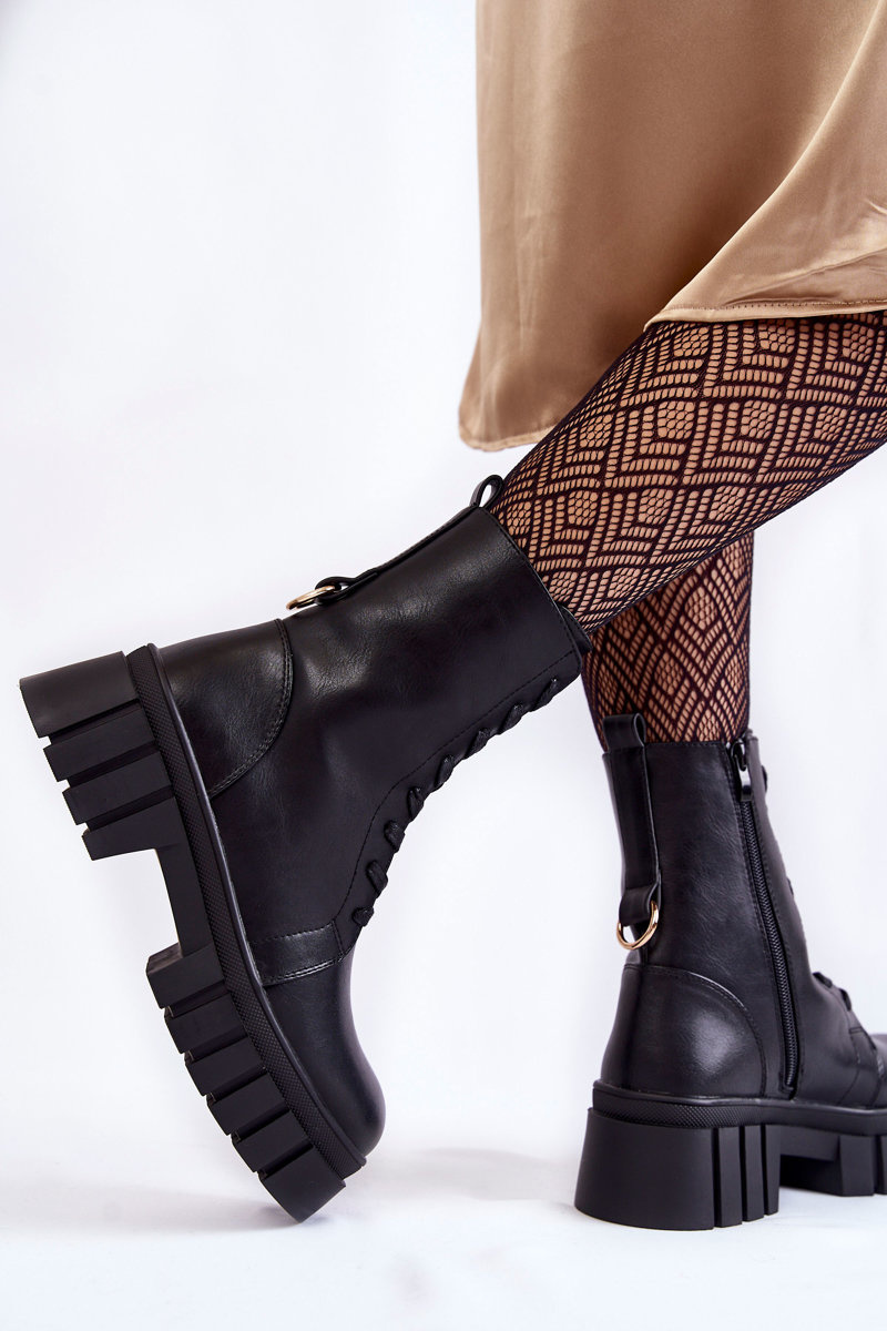 Classic women's boots have been enriched with an ornament on the back of the upper. Made of high-quality ecological leather. These boots have inside insulation in the form of a nice-to-the-touch shoe blanket. Fastened with a zipper and laced. They are mounted on a flat heel and a platform with grooves. The heel counter is stiffened. When choosing a size, please use the size chart.