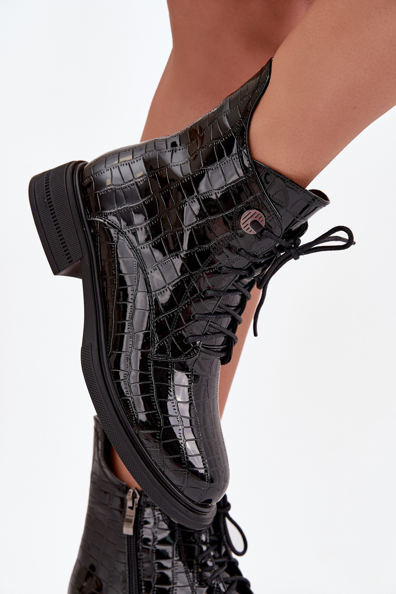 Women's ankle boots made of natural, patent leather are a stylish option for colder days. The shiny finish gives them an elegant and modern character. The model is fastened with a zipper and additionally laced, allowing for a perfect fit to the foot and easy wearing. The interior of the shoes is insulated, providing warmth and comfort even on colder days. This is a combination of classic and urban chic – perfect for everyday outfits and more elegant ensembles. Please refer to the size chart when choosing your size. When choosing a size, please refer to the size chart.