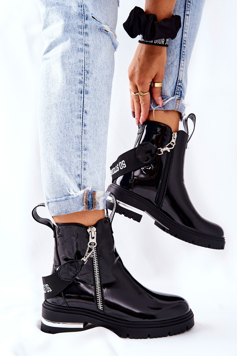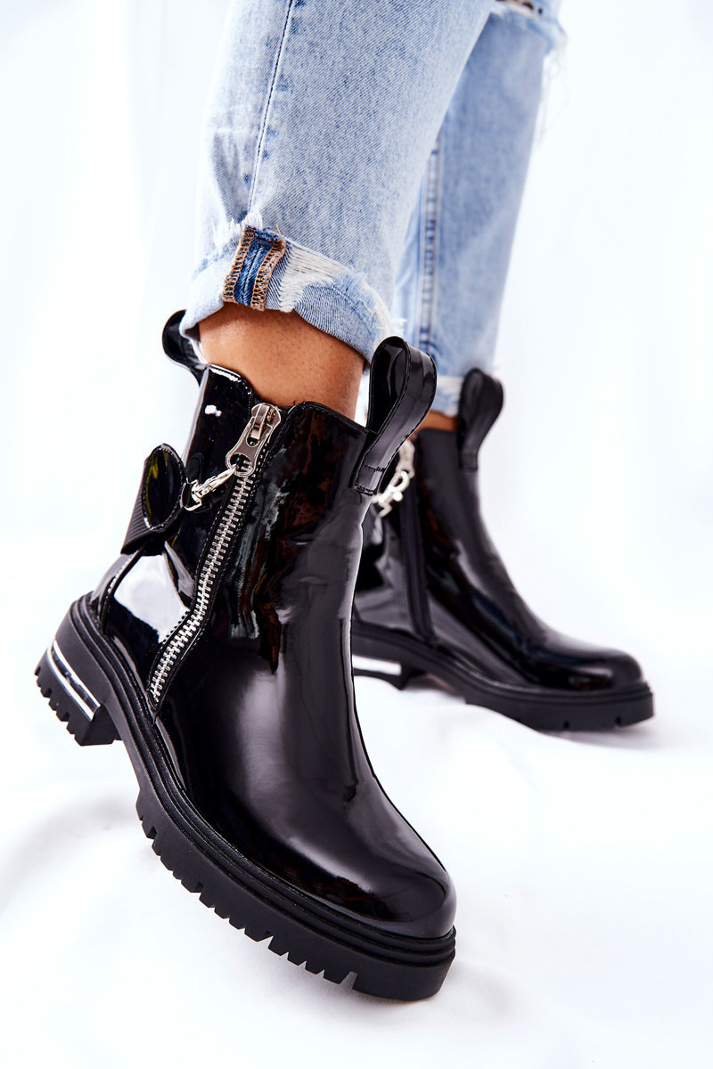 Women's boots made of lacquered eco leather. The inside is insulated with a nice-to-touch shoe blanket. They have a strap with zippers on both sides of the shoe. There is a decorative element on the heel. Be sure to check out our whole offer of boots! When choosing the size, please refer to the size chart..