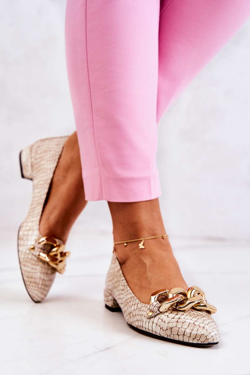 The shoes are made of high-quality natural leather. They have a soft, leather insert, additionally profiled and perforated. The elegant chain makes them look really special. The low, flat heel makes them very comfortable to wear for many hours. Check also other models of pumps! The insert may differ from the one shown in the photo depending on the delivery. When choosing a size, please use the size chart.