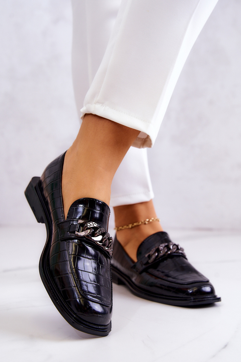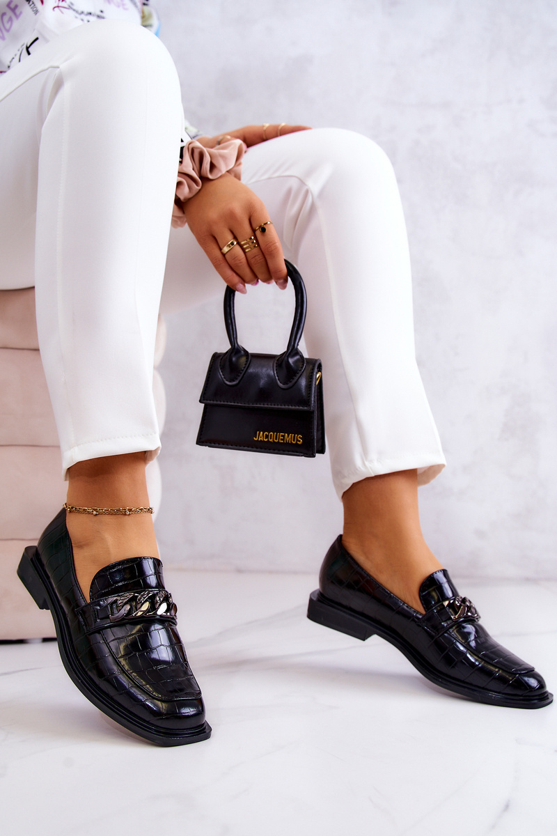 Slip-on loafers, mounted on a flat heel. Square nose. Decorated at the top with a chain with additional embossing. Made of eco leather. Loafers with a chain are a classic in a modern edition. The shoes have a comfortable insole made of natural leather. Great design that fits perfectly into the current trends! They will be perfect for work, business meetings or various celebrations. They blend in very well with elegant skirts and trousers. When choosing a size, please use the size chart.