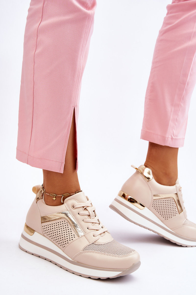 Comfortable sneakers made of eco leather with delicate perforations on the sides of the upper and a fabric insert at the front. Classic lace-up model. The shoes were set on a platform and a low wedge heel. The soft insole will ensure comfortable use of the footwear even throughout the day! When choosing a size, please refer to the size chart.