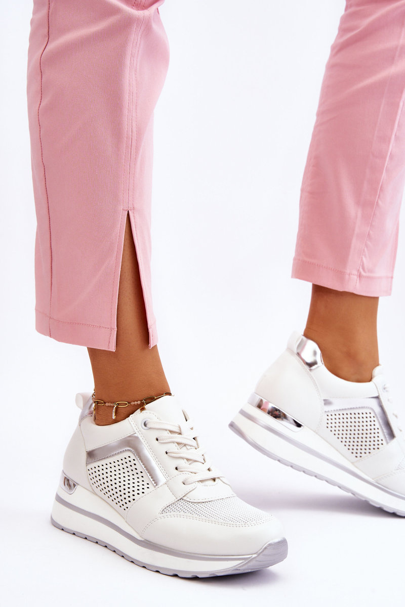 Comfortable sneakers made of eco leather with delicate perforations on the sides of the upper and a fabric insert at the front. Classic lace-up model. The shoes were set on a platform and a low wedge heel. The soft insole will ensure comfortable use of the footwear even throughout the day! When choosing a size, please refer to the size chart.