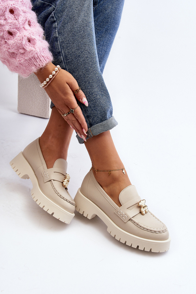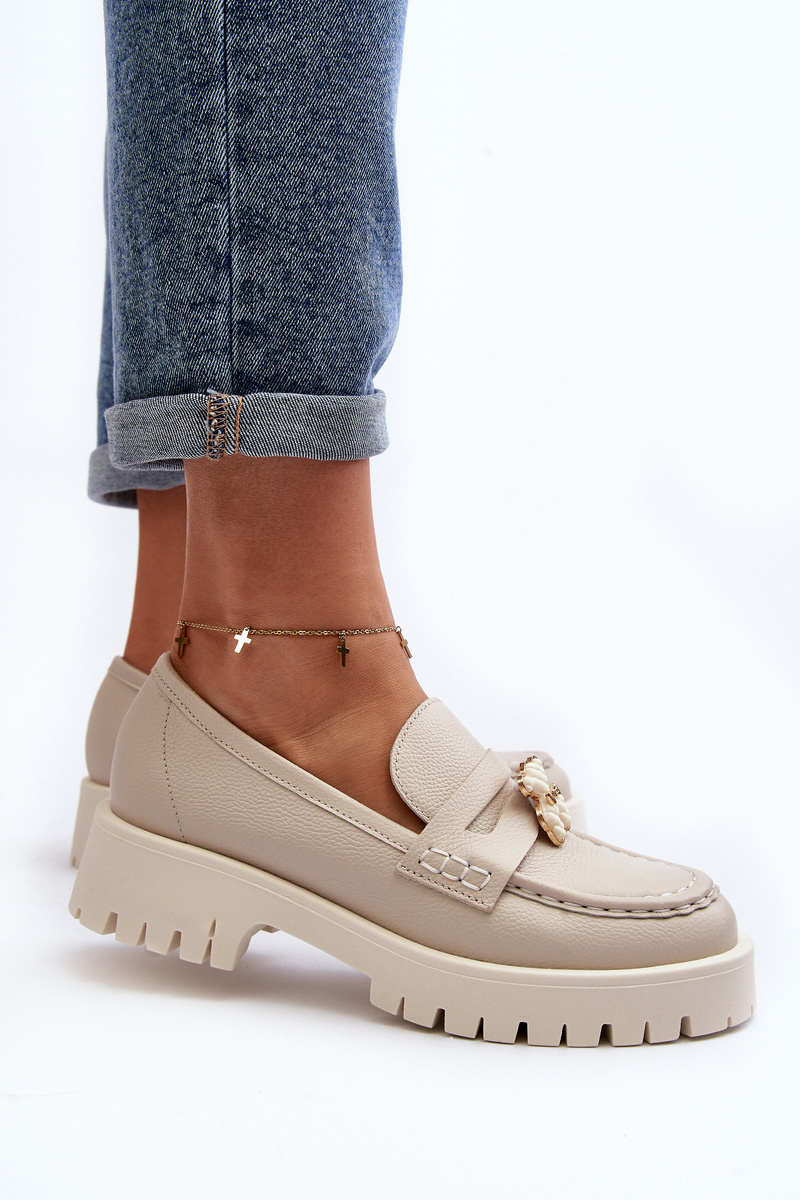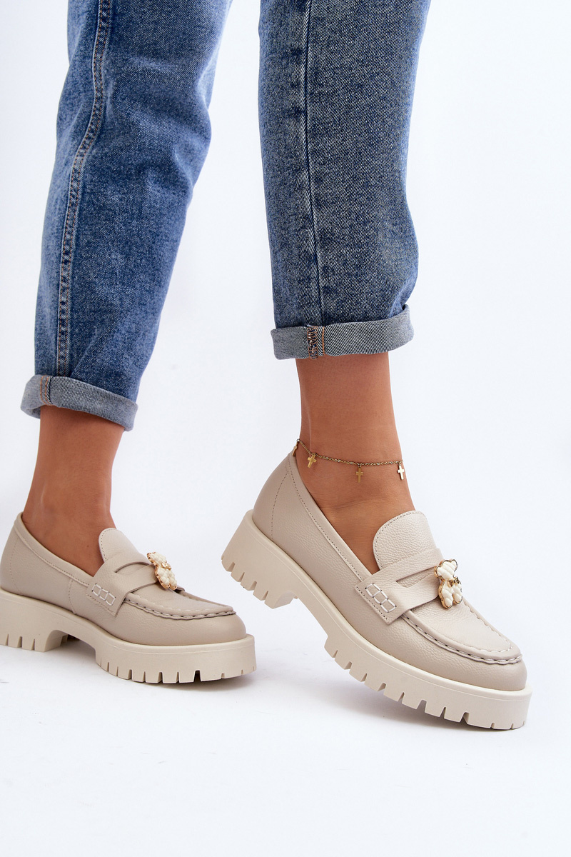 Beautiful, women's moccasins made of natural leather. Set on a flat, massive heel. The leather insole in these moccasins is soft and comfortable to wear. This model has a decoration on the strap. This style is perfect for everyday outfits! When choosing a size, please refer to the size chart.