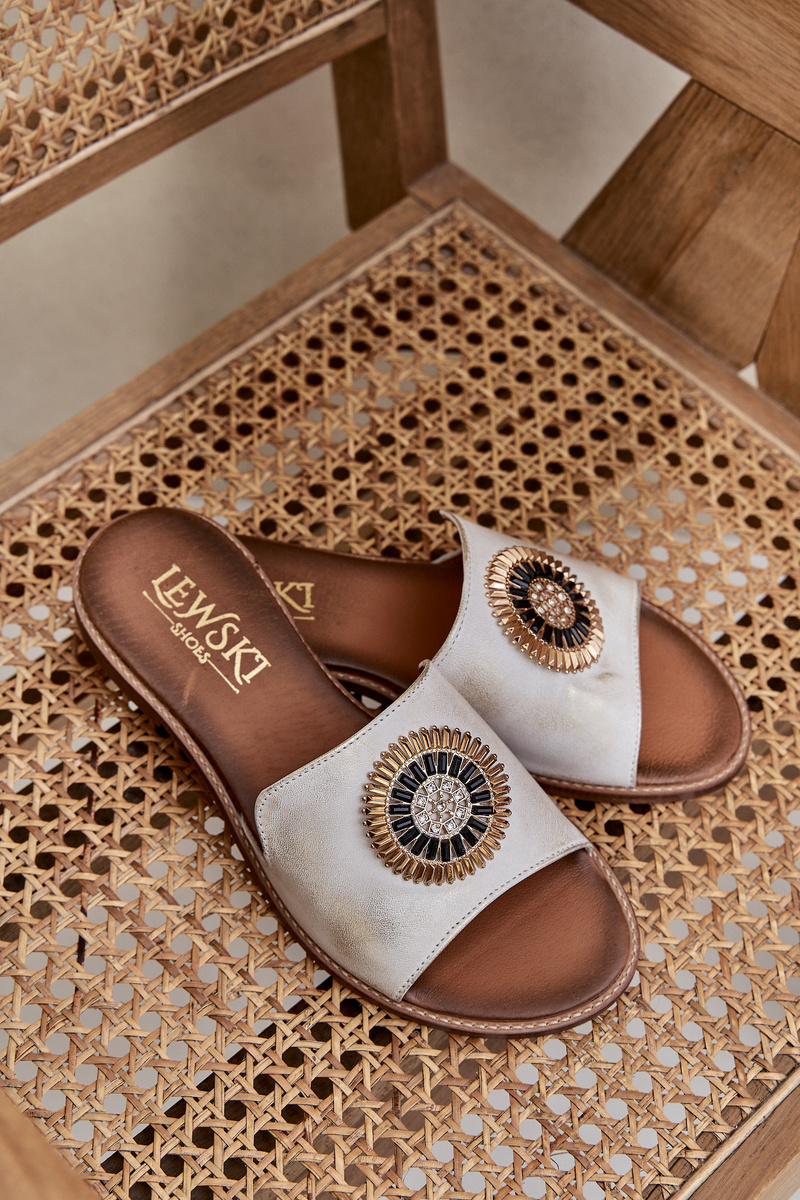 Leather Slippers With Decoration On Flat Heel Gold Distressed Lewski 3047/O