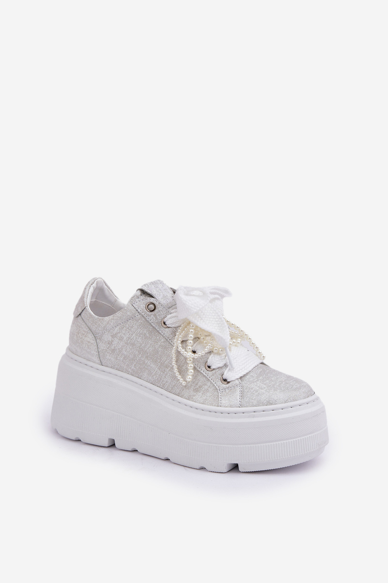Women's sneakers from the brand Chebello are an elegant option for women who value comfort and stylish design. Made from high-quality natural leather, they ensure durability and a timeless look. Set on a massive platform that adds style and visually elongates the legs. The model features classic lacing, enhanced with subtle beads that add character. The toes are rounded, which affects wearing comfort, while the leather insole provides comfort throughout the day. This is the perfect combination of fashion and functionality in one style. When choosing a size, please refer to the size chart.