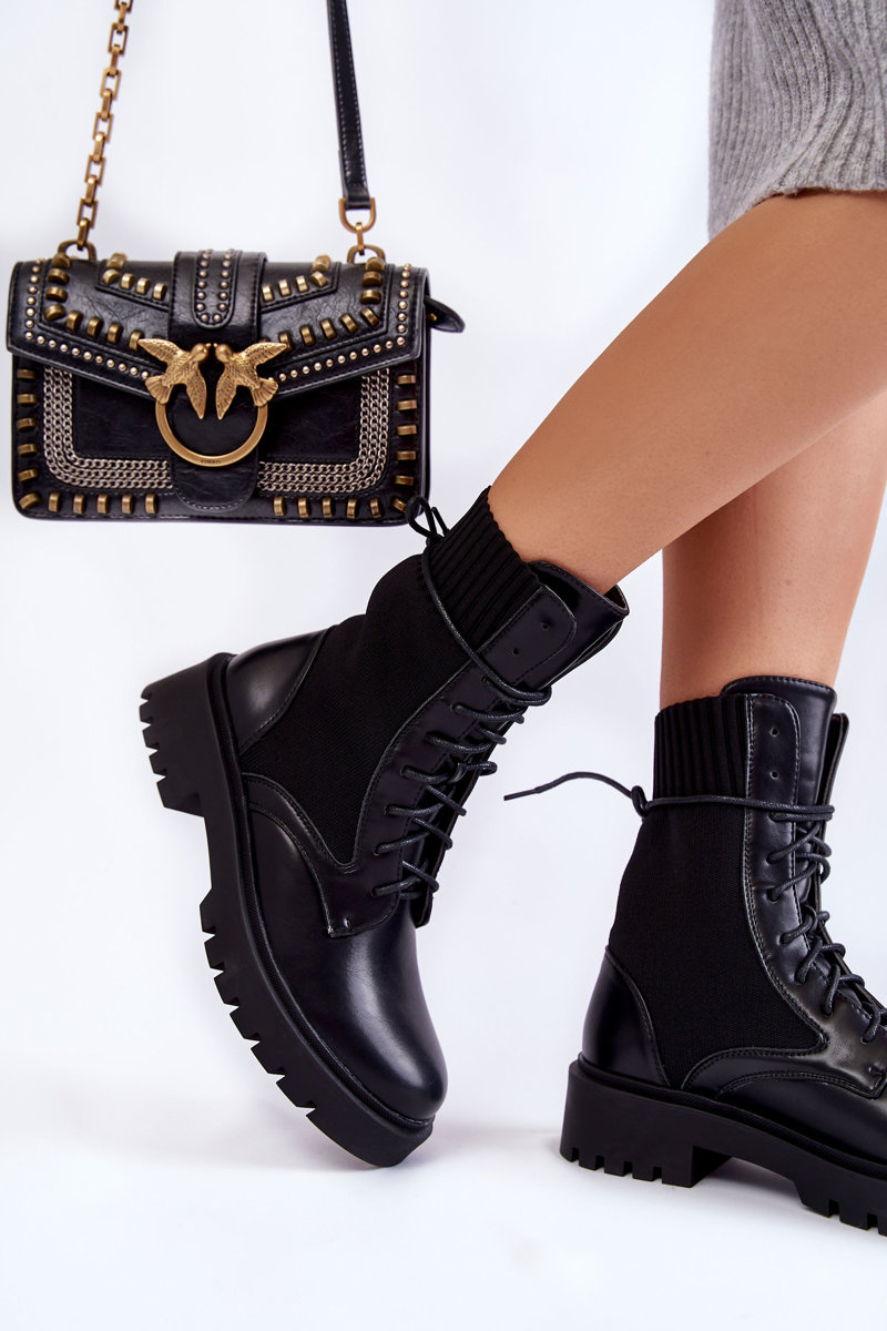 These women's boots are great for many styles! Made of a combination of elastic material and eco leather. This model has a solid lacing, thanks to which you can properly adjust the footwear to the leg width. The heel counter is stiffened. The boots are mounted on a flat heel and a platform with grooves. The upper part of the upper has a delicate welt. When choosing a size, please use the size chart.