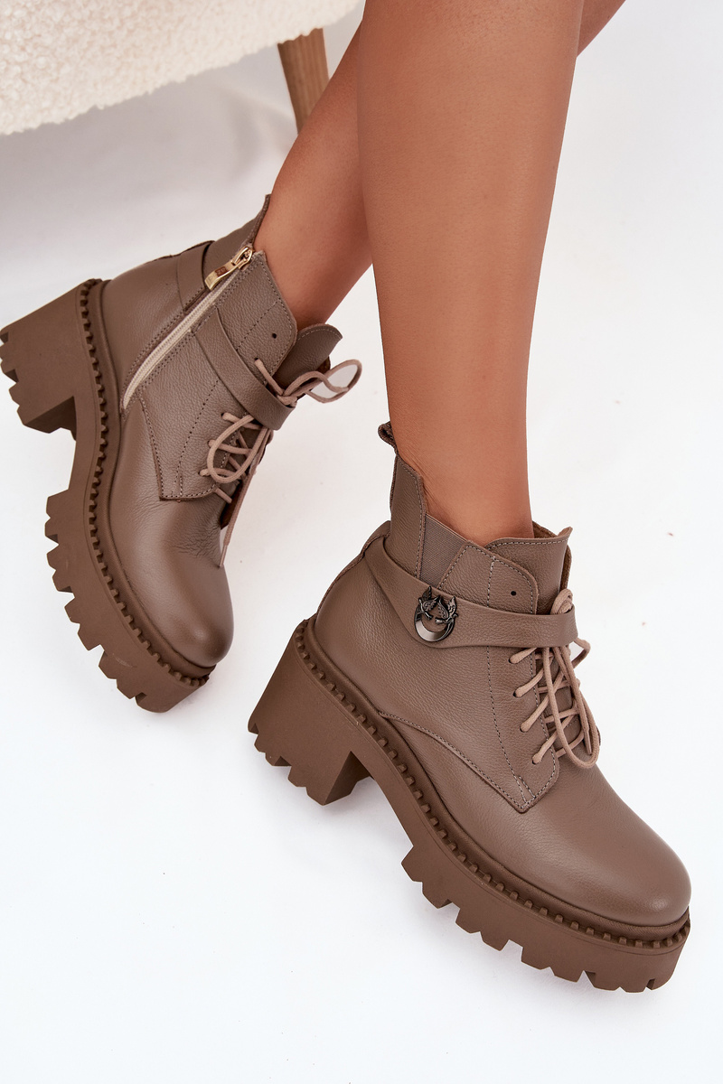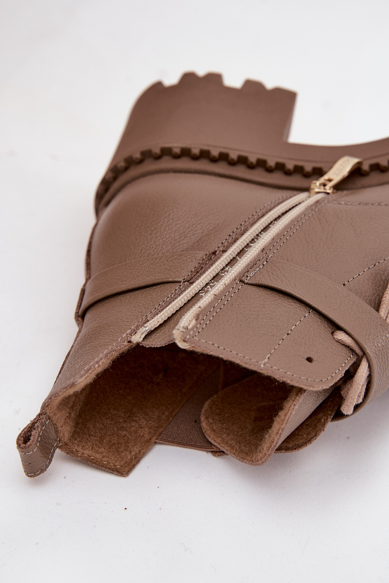 Leather Women's Block Heel Boots with Decorative Strap Lined Zazoo 60557 Dark Beige
