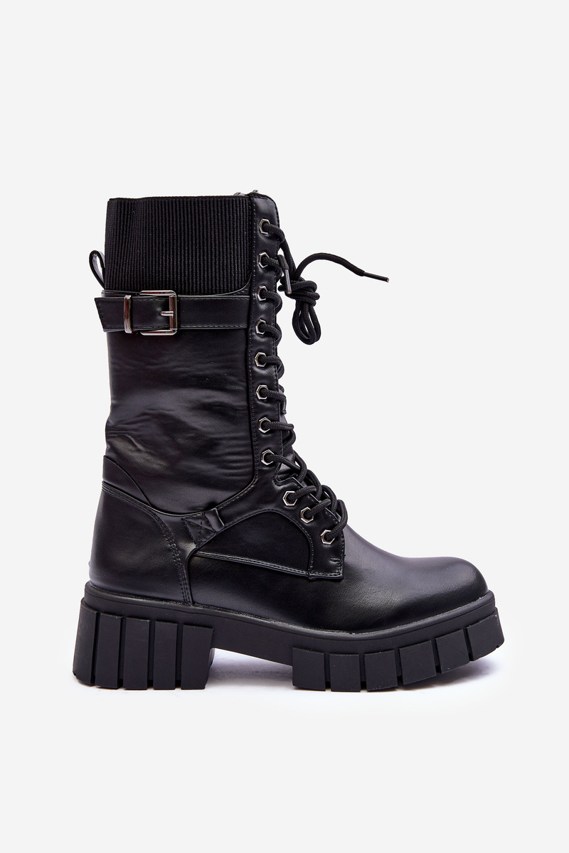 Boots made of eco-leather. Set on a massive heel and platform. Fastened with a zipper on the side and additionally laced. This model has an elastic insert and a strap with a buckle. Check out our entire collection of high boots! When choosing a size, please refer to the size chart.