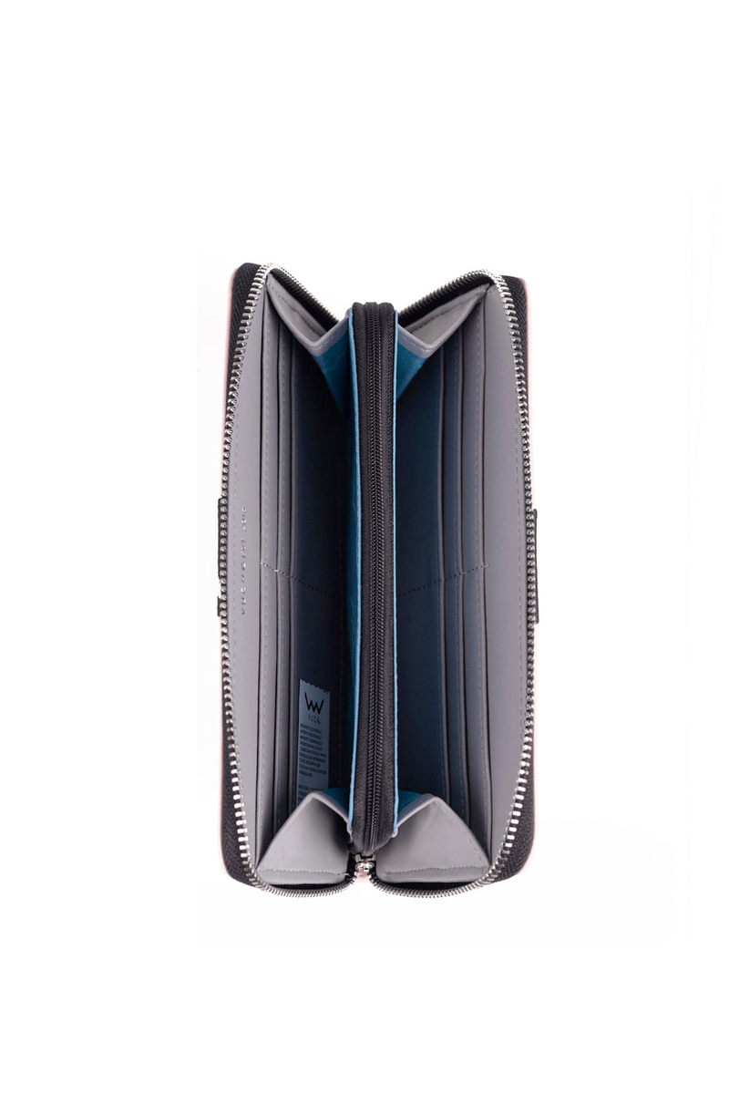 Beautiful wallet made of eco leather with a sewn-in fabric strap with logo. Zipped closure. Inside it has smaller open pockets for business cards or credit cards and a space for notes. Inside there is also a zipped pocket for coins. A unique model that will delight many people should be yours! Do not hesitate and buy it today!