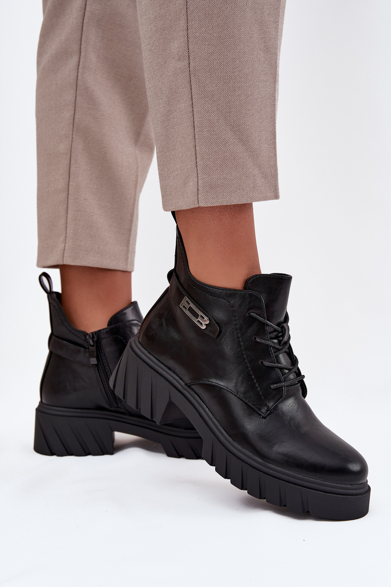 Low women's ankle boots by Jezzi made from high-quality eco-leather combine comfort and fashionable look for everyday wear. Set on a stable block heel, they ensure a confident step and all-day comfort. The model combines practical lacing with a zipper, allowing quick on and off and a perfect fit to the foot. The upper features a subtle decorative strap that adds an elegant touch, making them suitable for both casual and more formal outfits. Please refer to the size chart when choosing your size. When choosing a size, please refer to the size chart.
