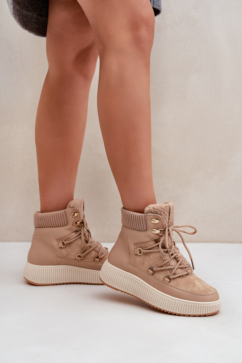 Low platform snow boots are the perfect footwear for winter days. The model features a tongue adorned with soft shearling, giving it a cozy and stylish appearance. The interior is insulated with a shoe blanket. Lacing with additional hooks allows for precise fitting of the shoes to the foot. Functional, fashionable, and comfortable – perfect for winter walks and everyday styling. When choosing a size, please refer to the size chart.