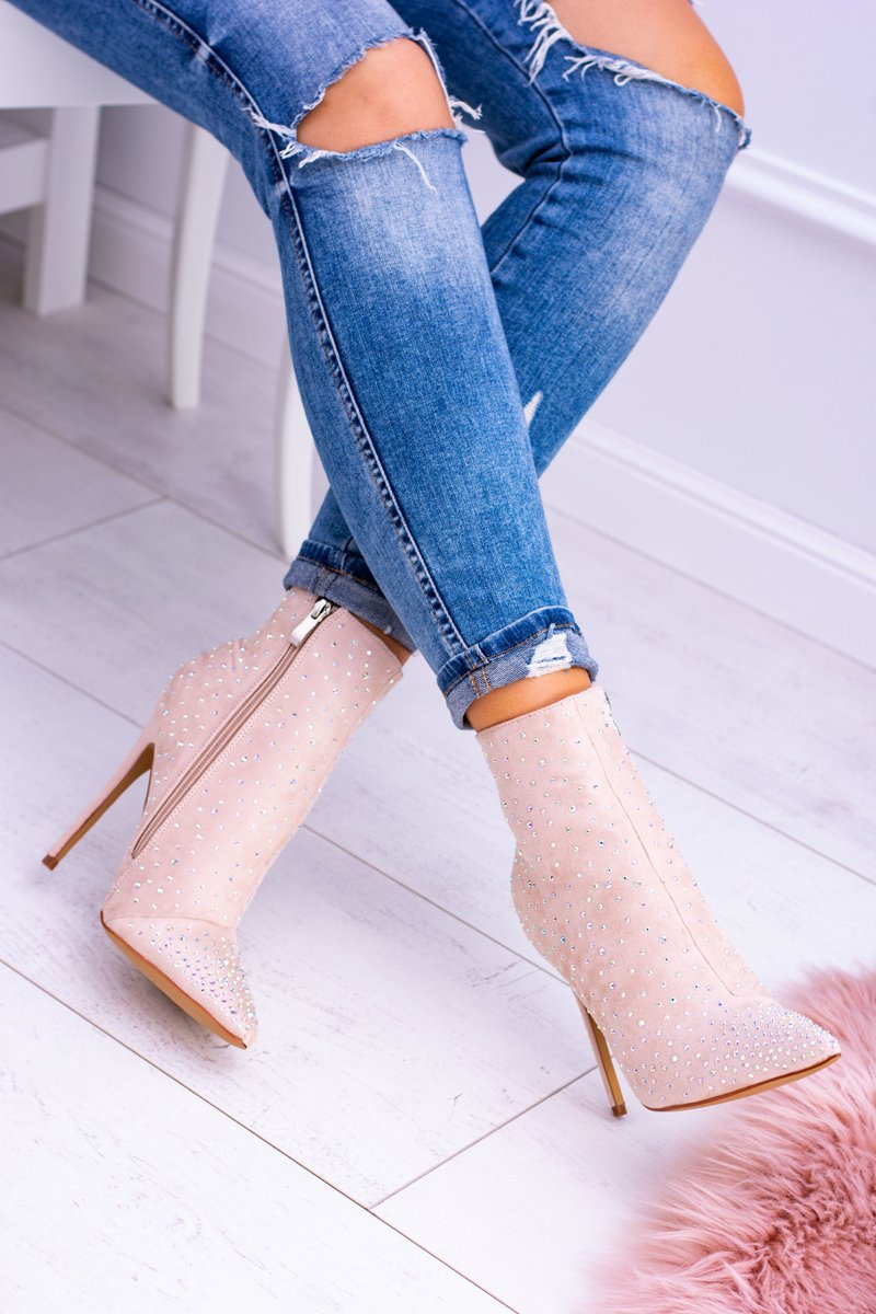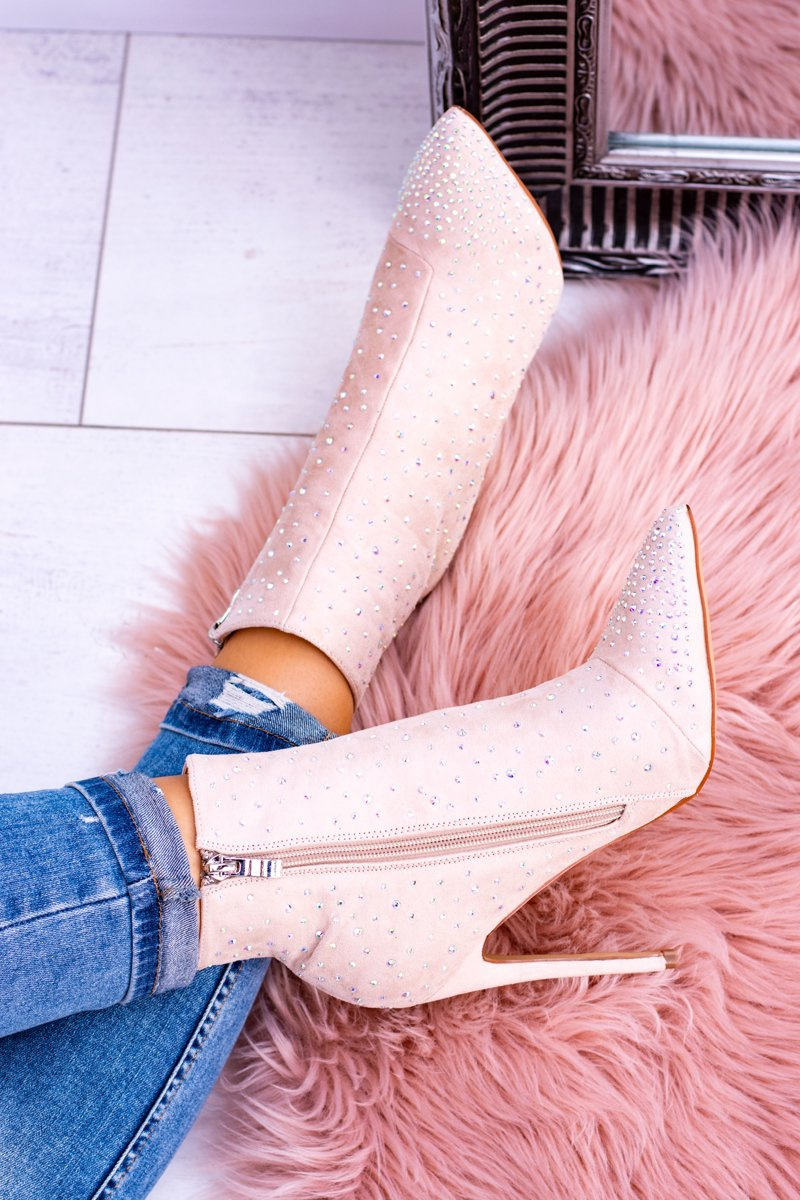 Lu Boo Beige High Suede Cubano Zirconia Stiletto Booties