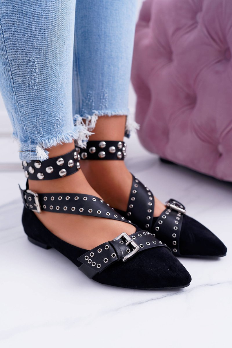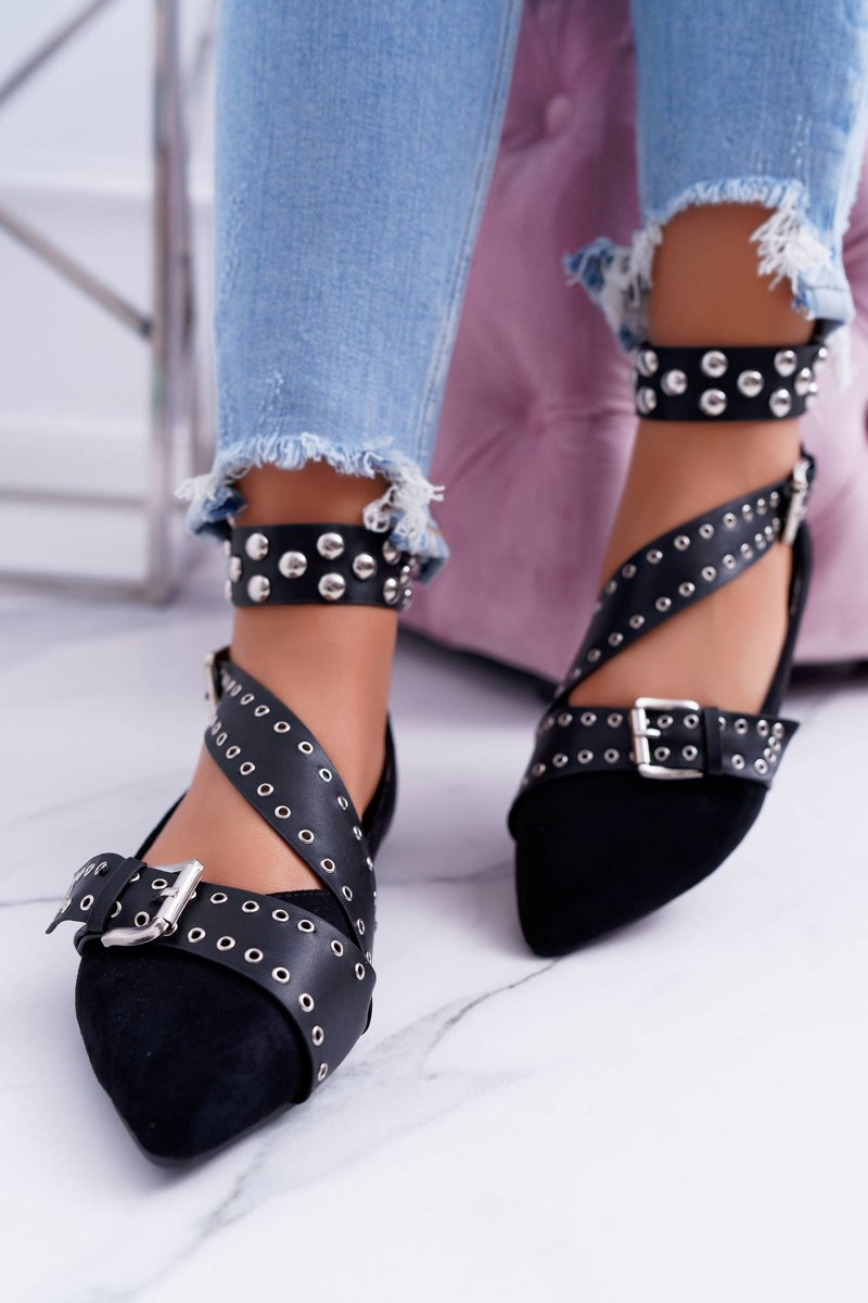 Lu Boo | Black Strappy Ballerinas Rivets Pointed Esteria